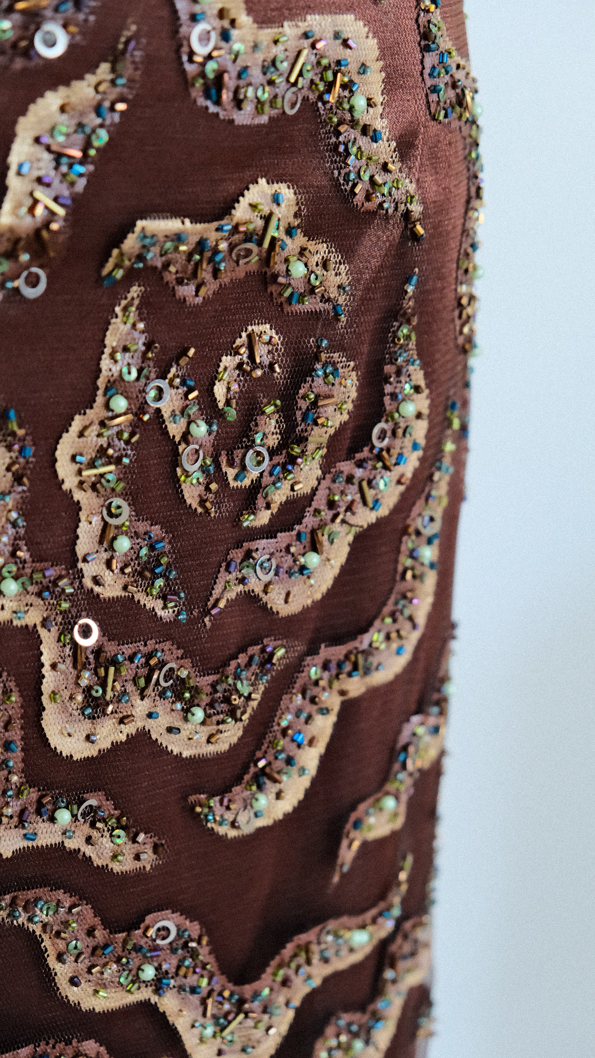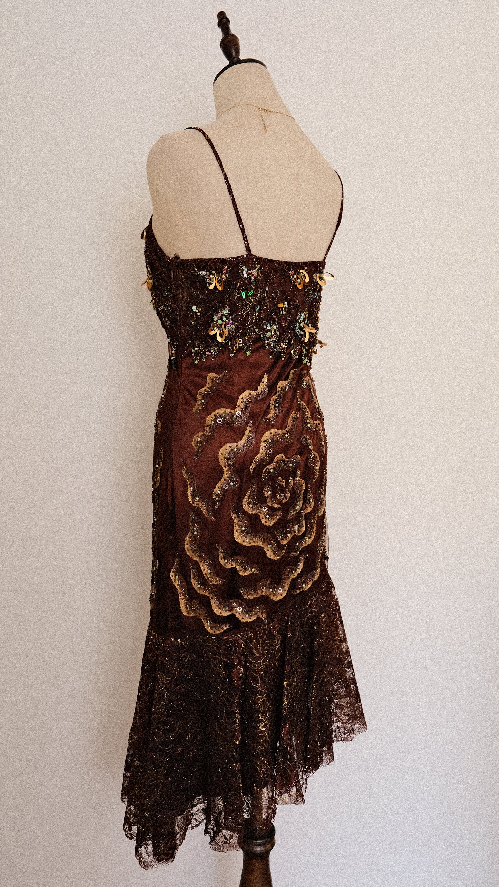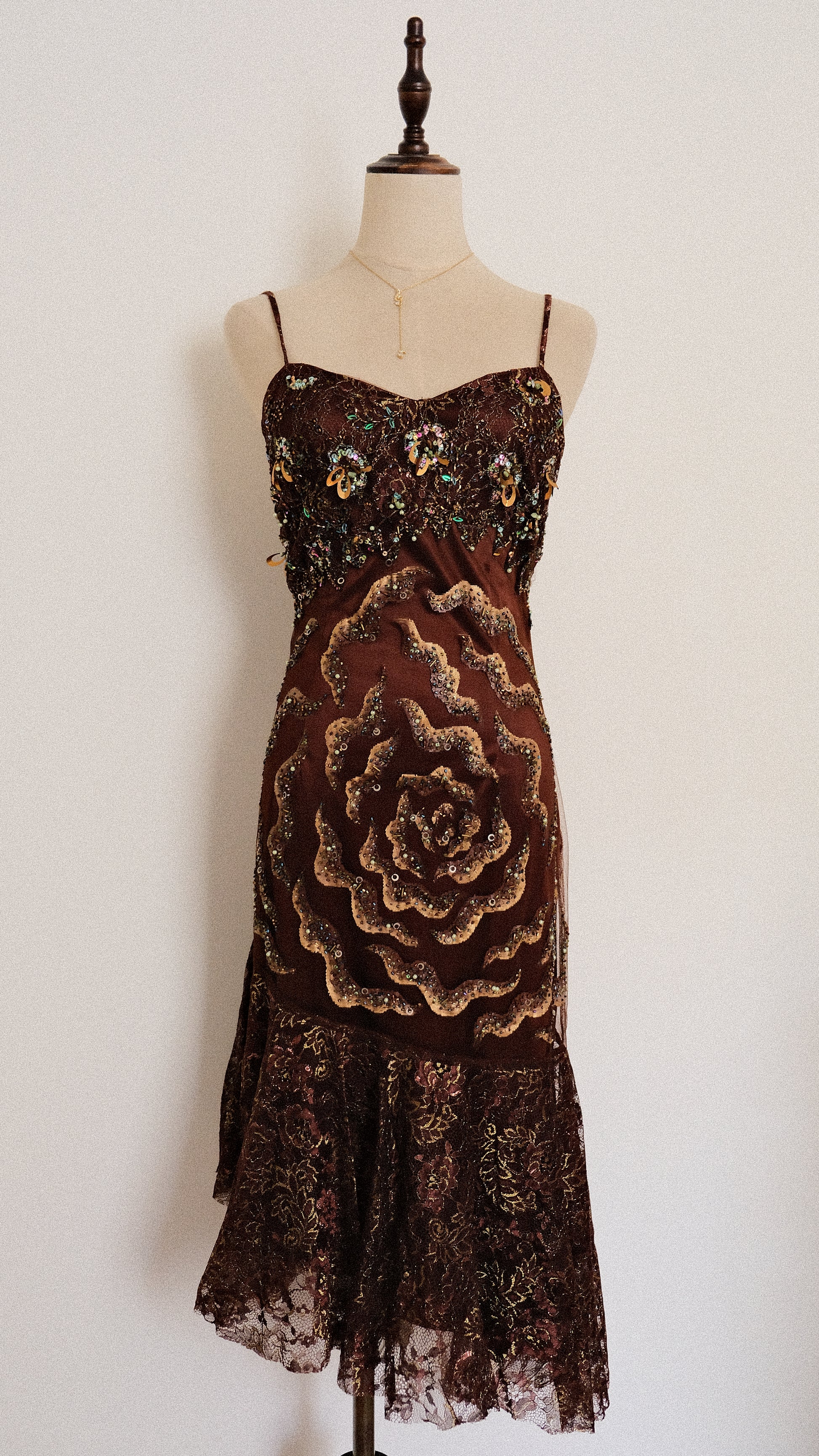 A deep chocolate blooming rose dress that captures the essence of earthy elegance and ethereal beauty.