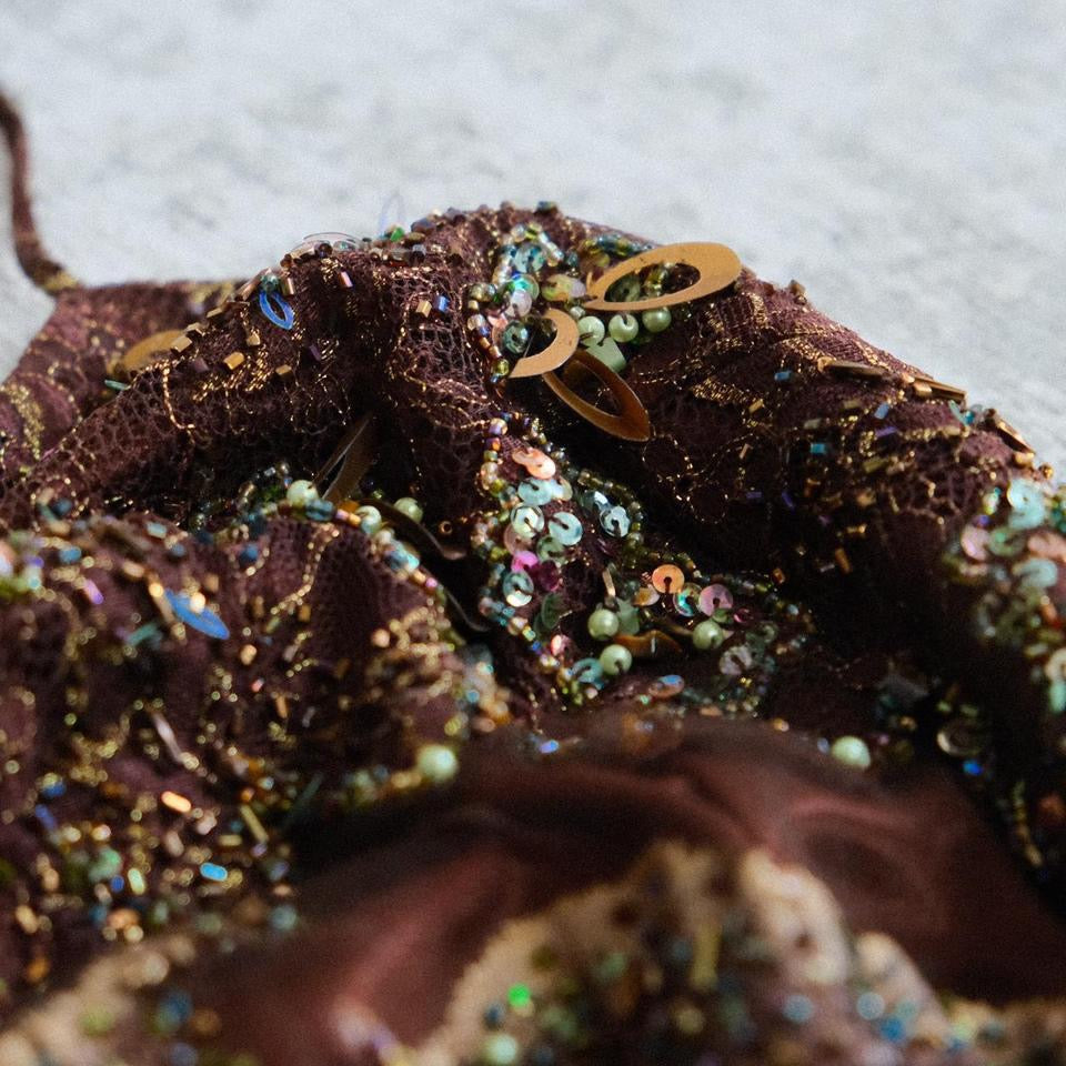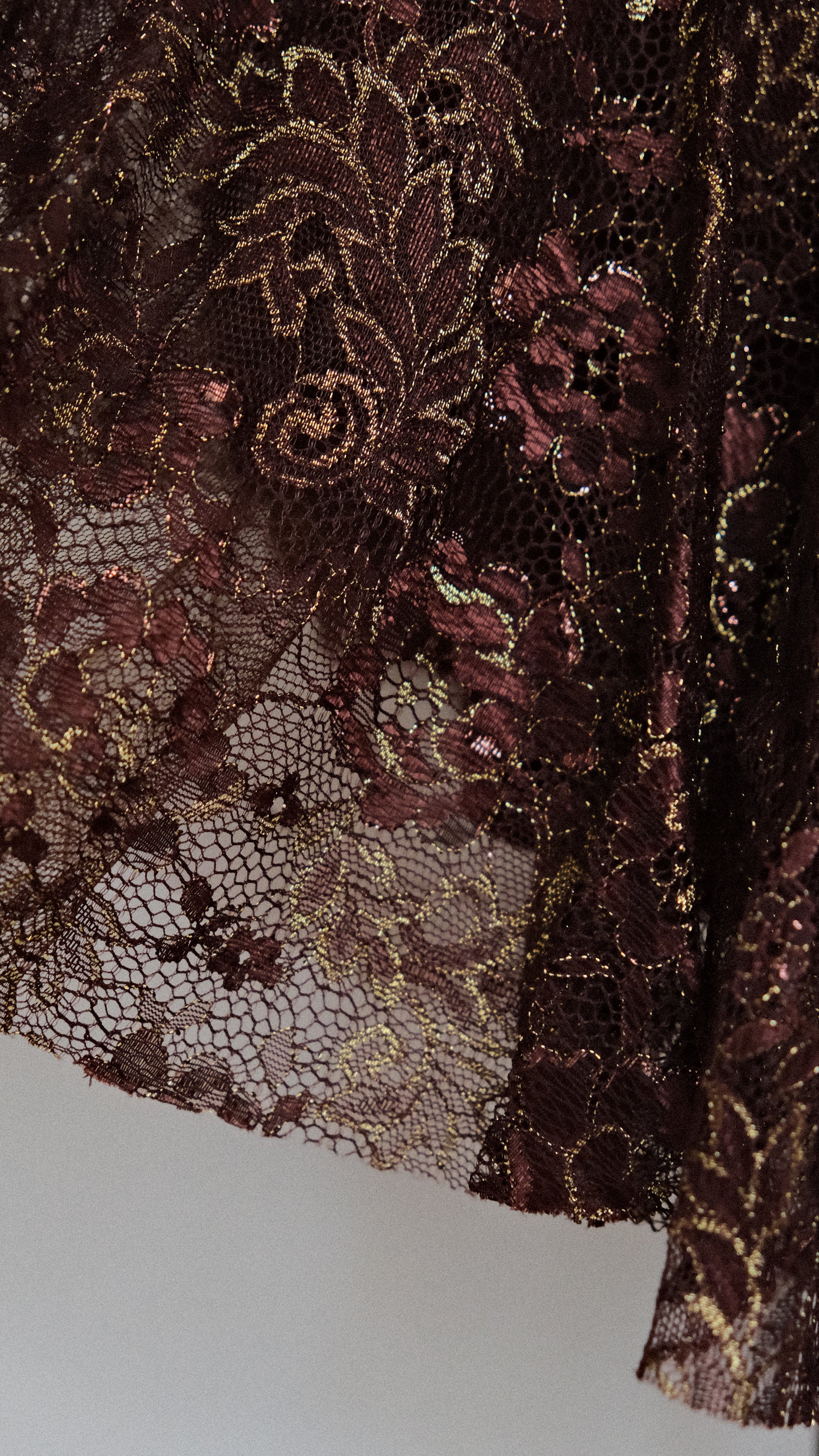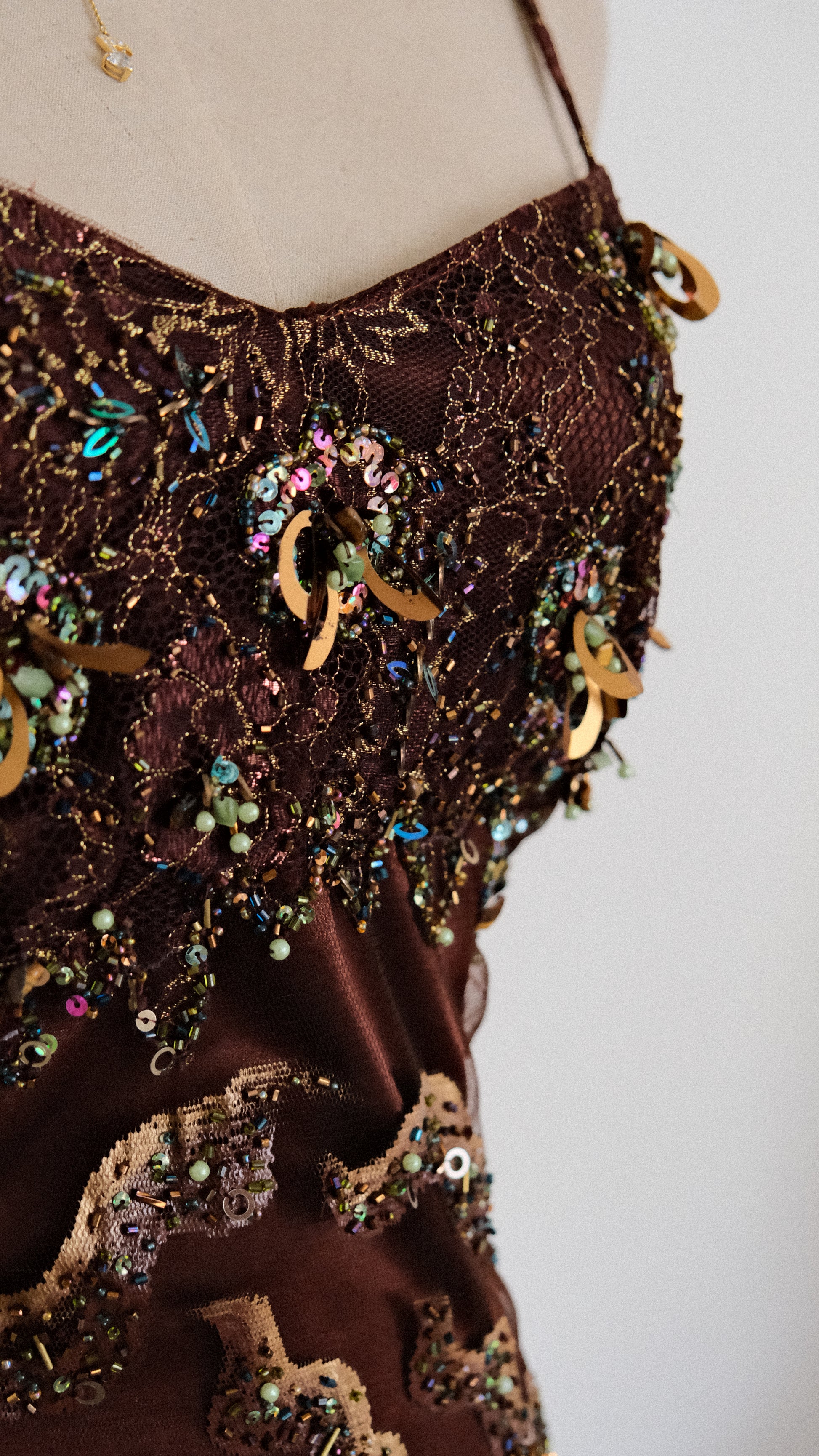 A deep chocolate blooming rose dress that captures the essence of earthy elegance and ethereal beauty.