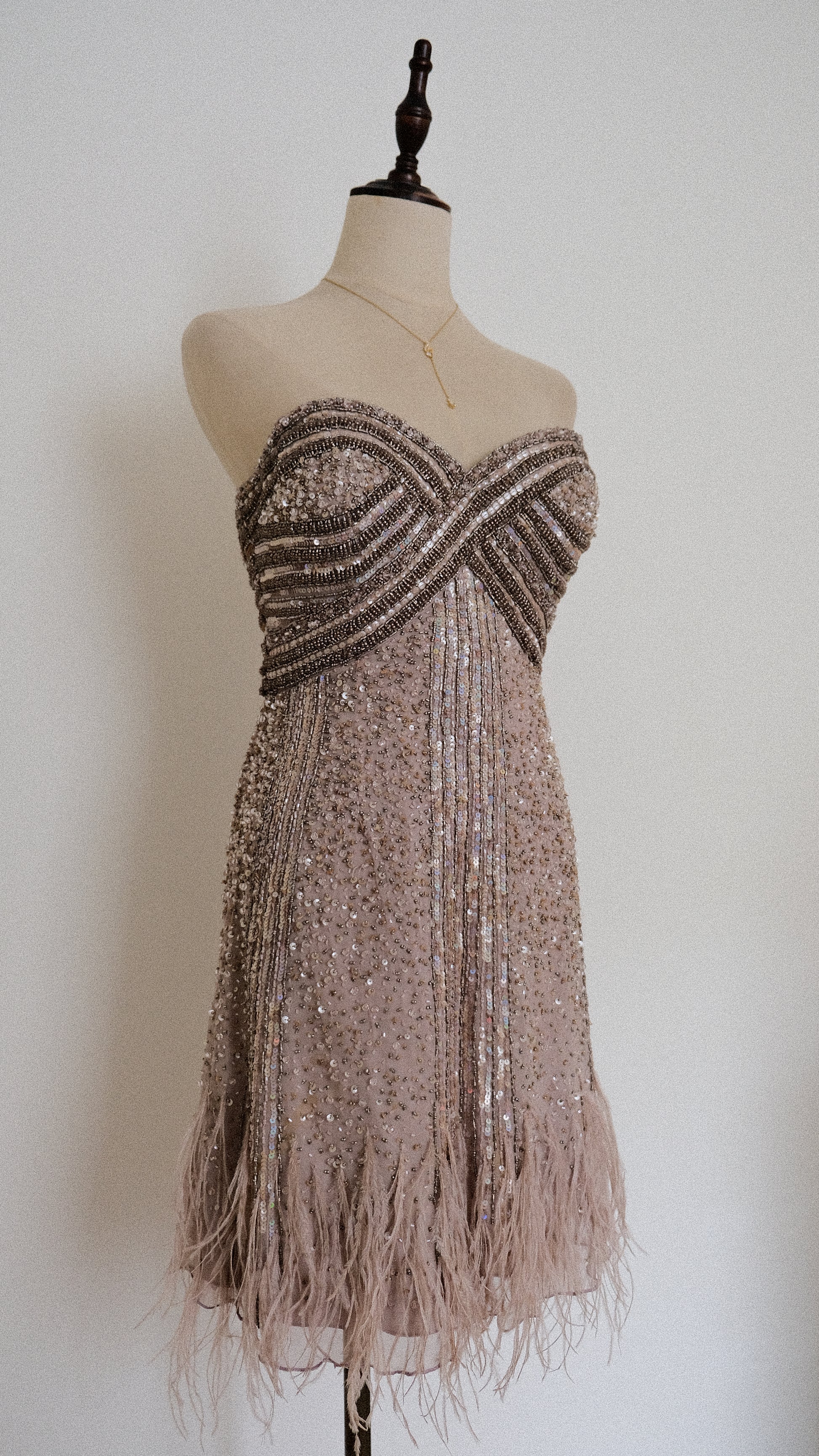 A sparkling dress for a dazzling night out! An enchanted embellished bustier dress with feather detailing at the edges of the bottom of the dress for a romantic look.