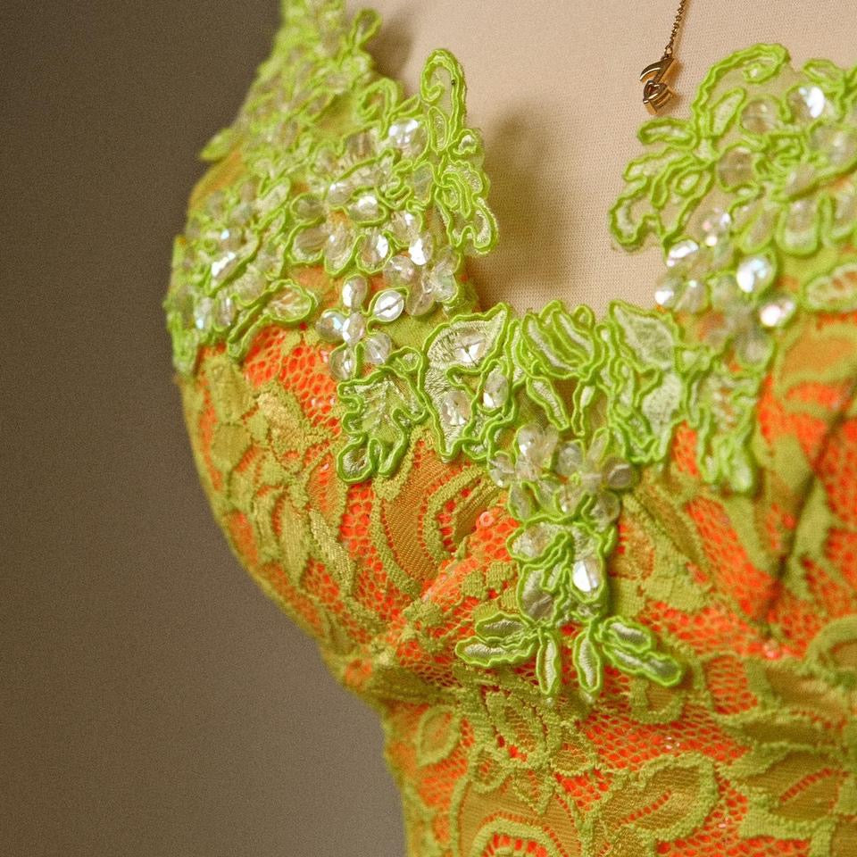 A rare English designer corset dress covered in bright orange sequins with on top a lime lace layer. Brand Catwalk Collection London.