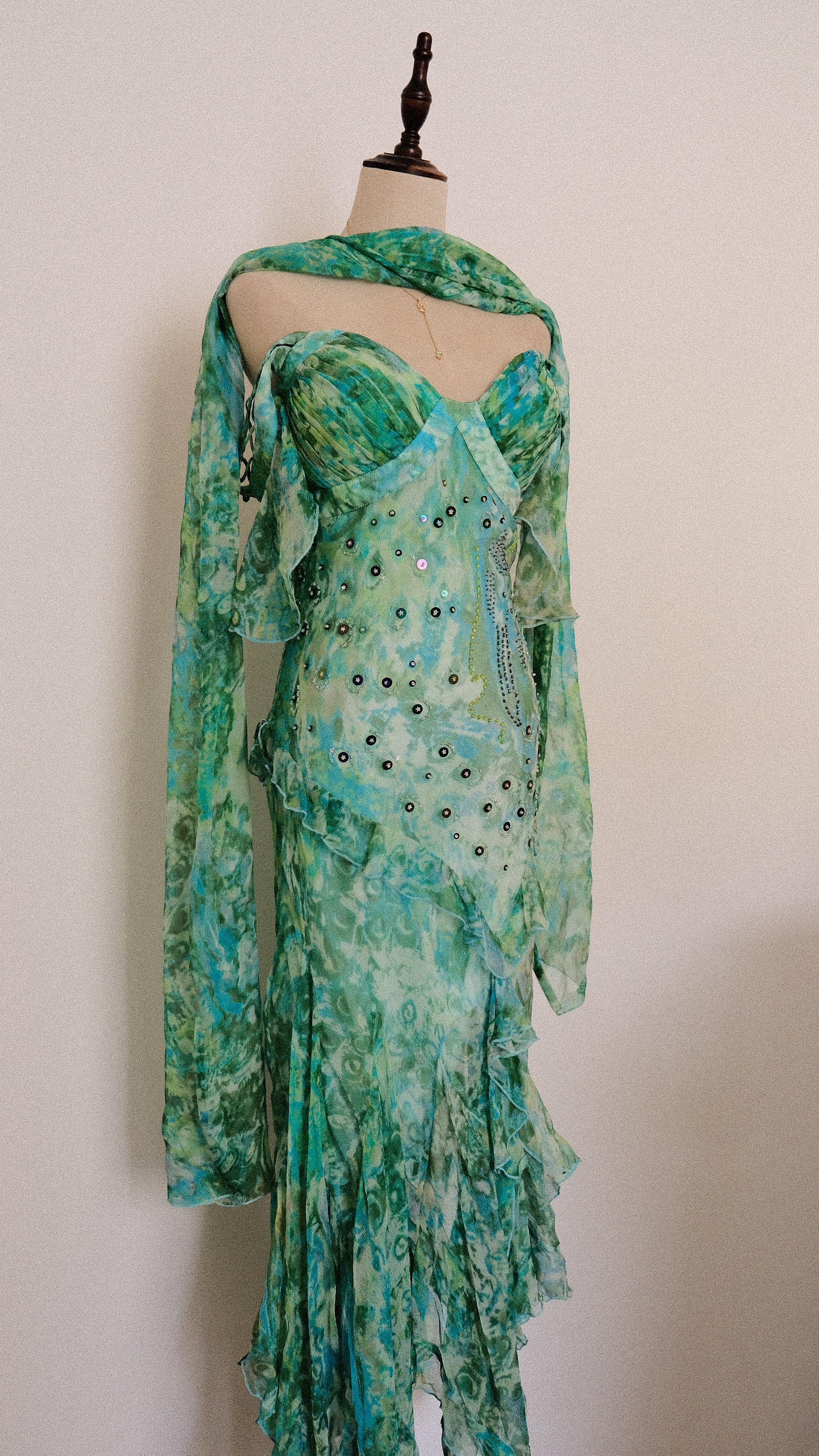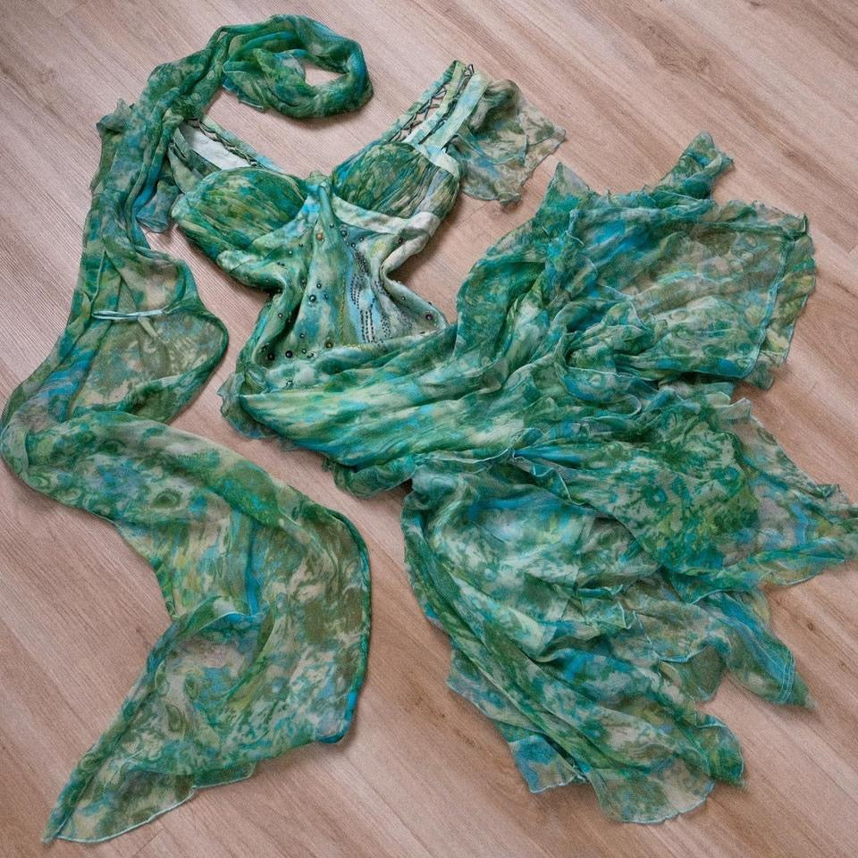 A dark green fairtyale dress with flutter sleeves an asymmetrical cut at the bottom for an enchanted and dreamy fairy look.