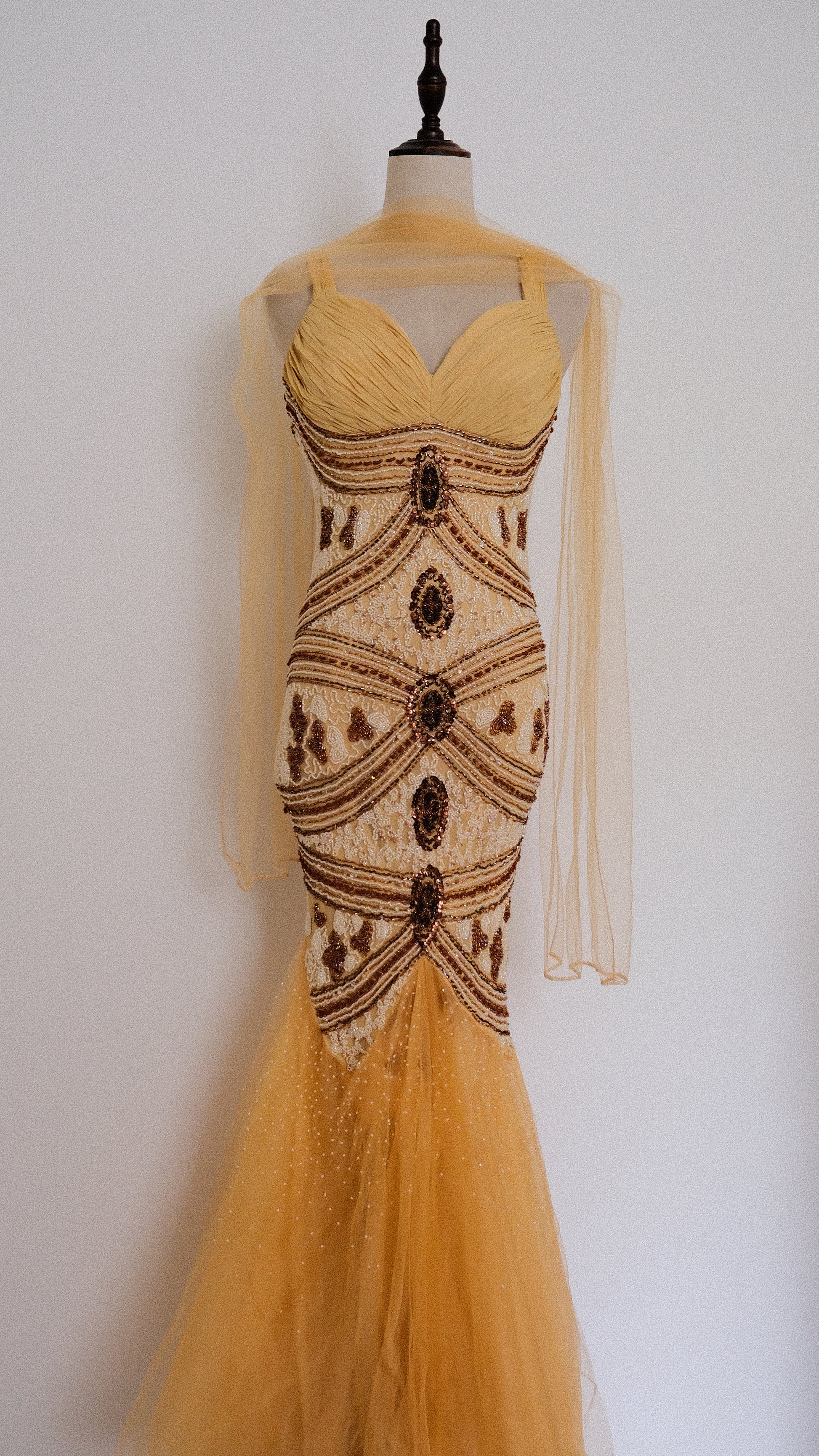 A honey golden evening gown with the most beautiful embellished detailing and tutu effect at the bottom creating a mermaid shape.