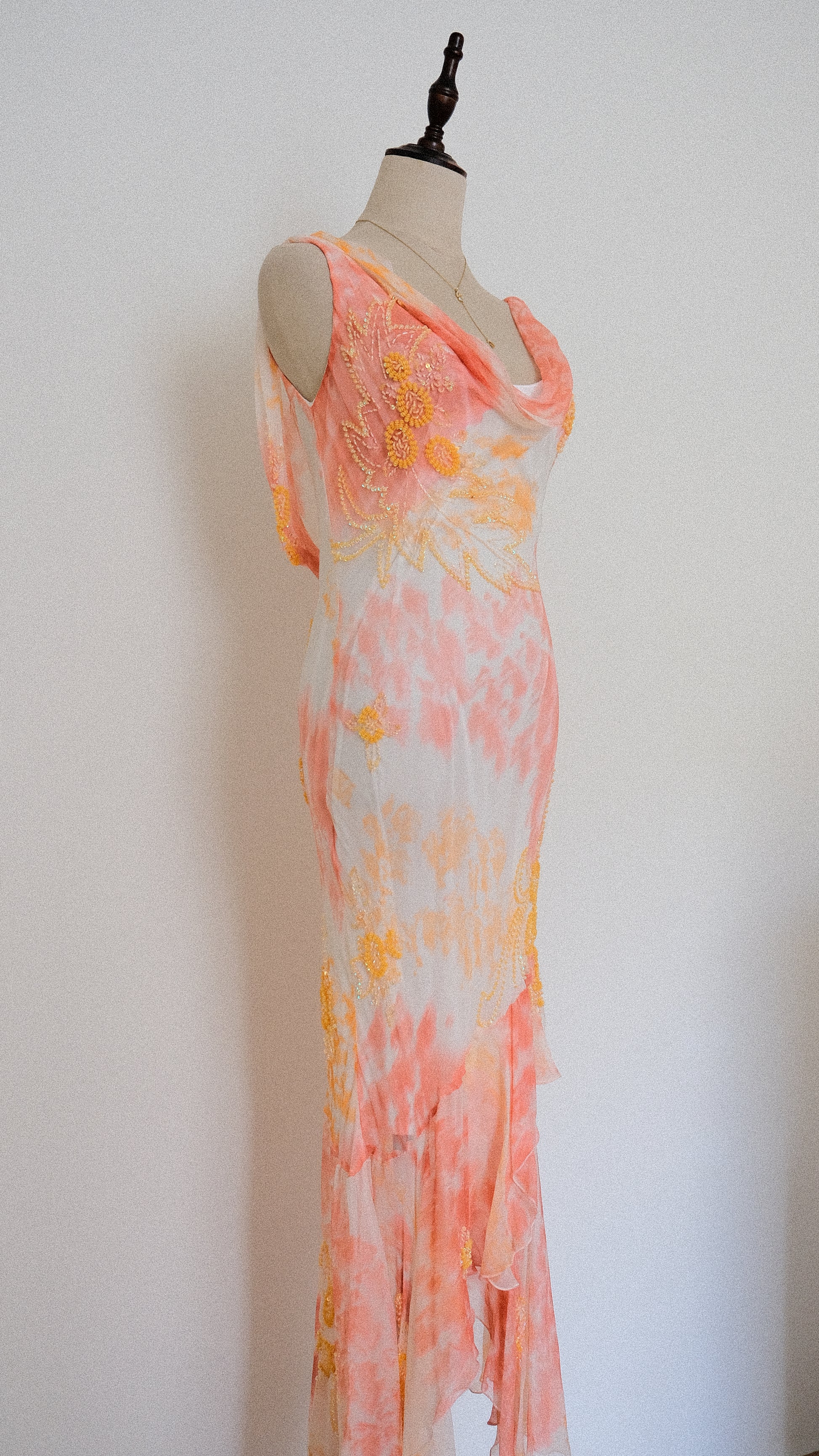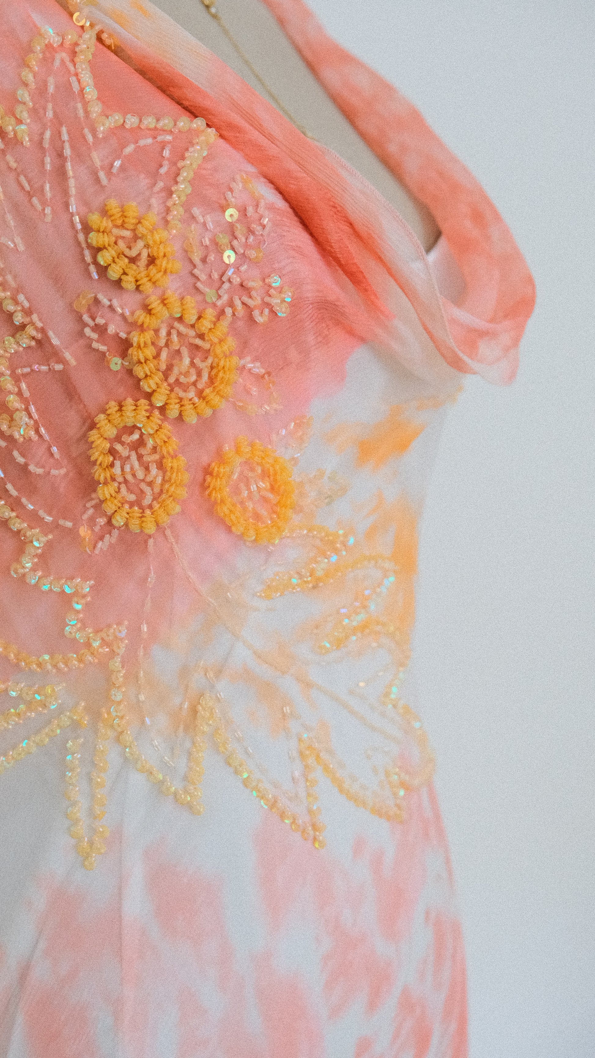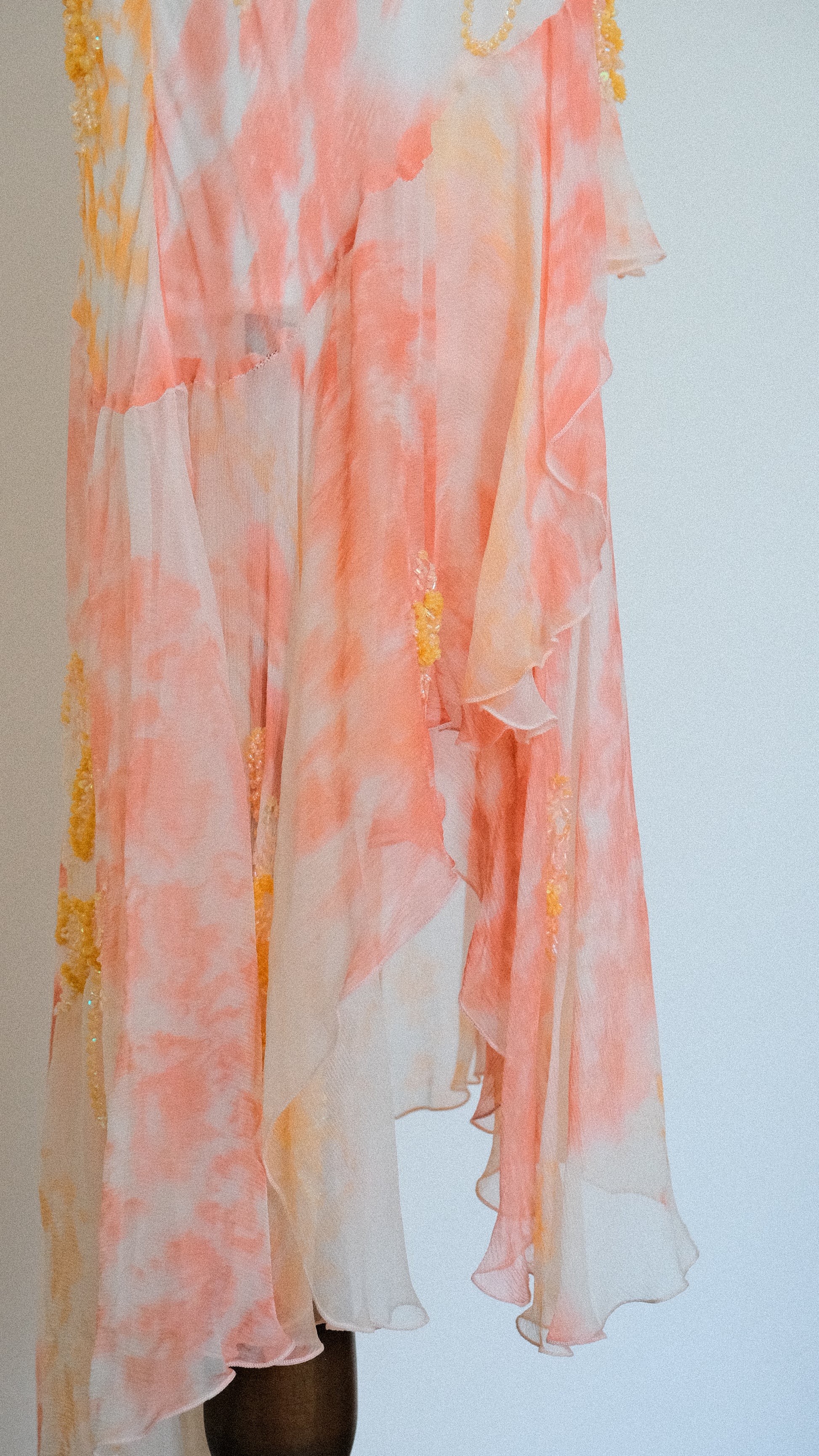 A peachy fairycore dress with a draped back, asymmetrical cut at the bottom and embellished detailing.