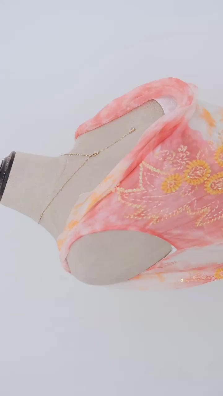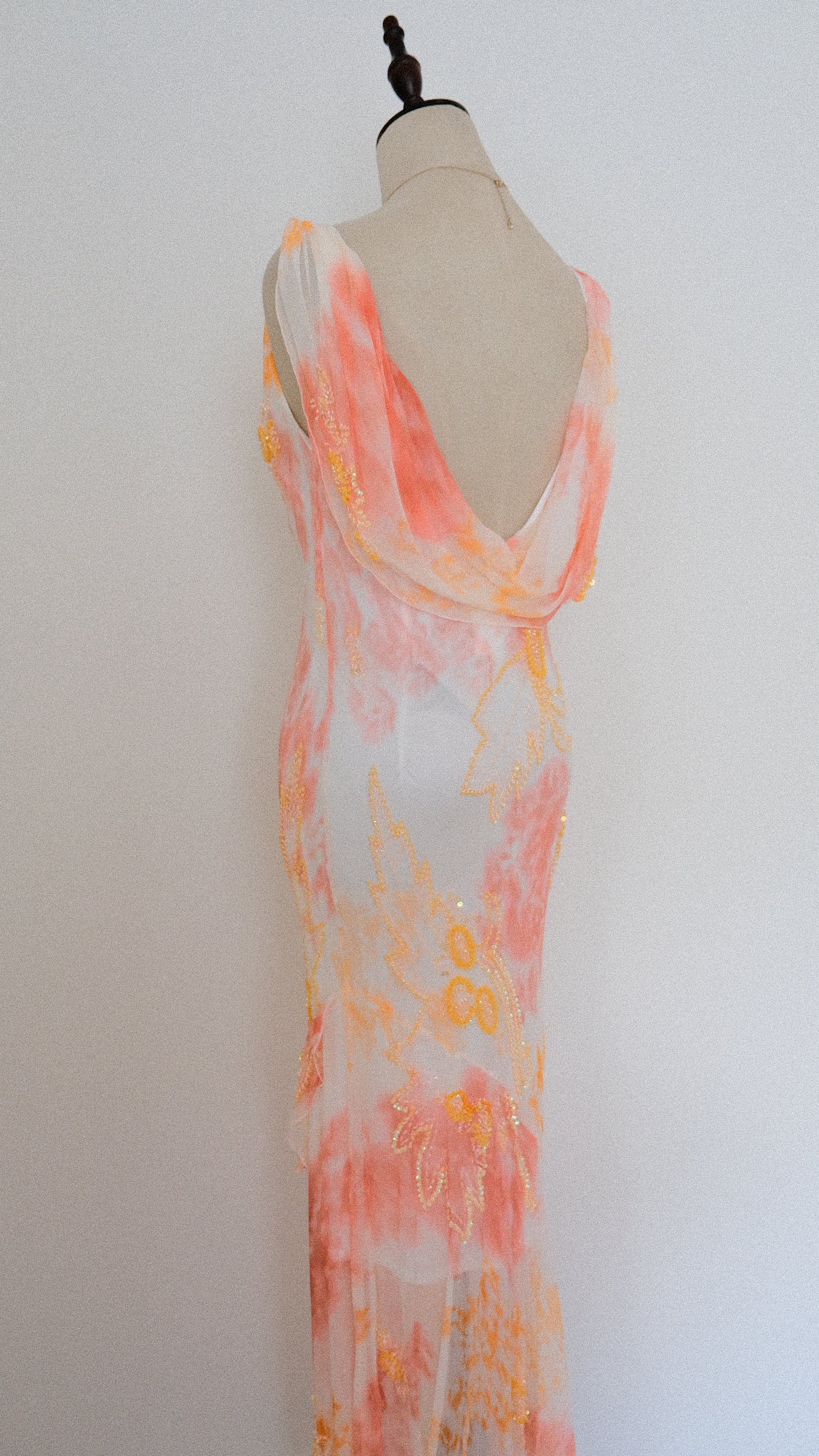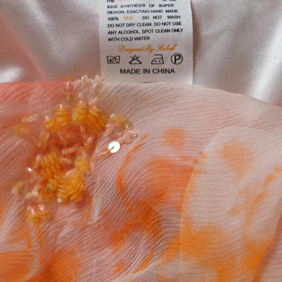 A peachy fairycore dress with a draped back, asymmetrical cut at the bottom and embellished detailing.