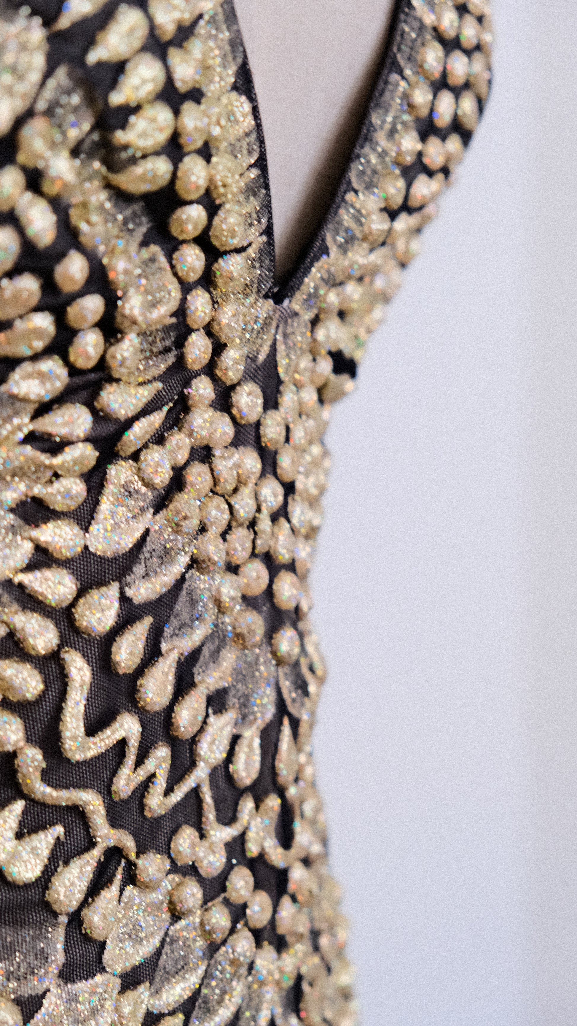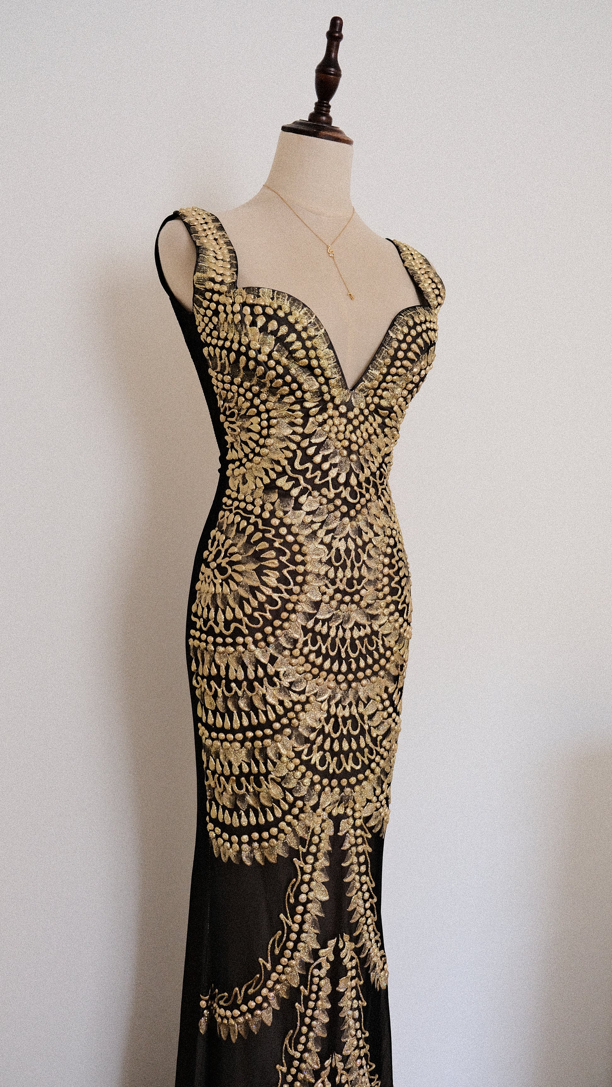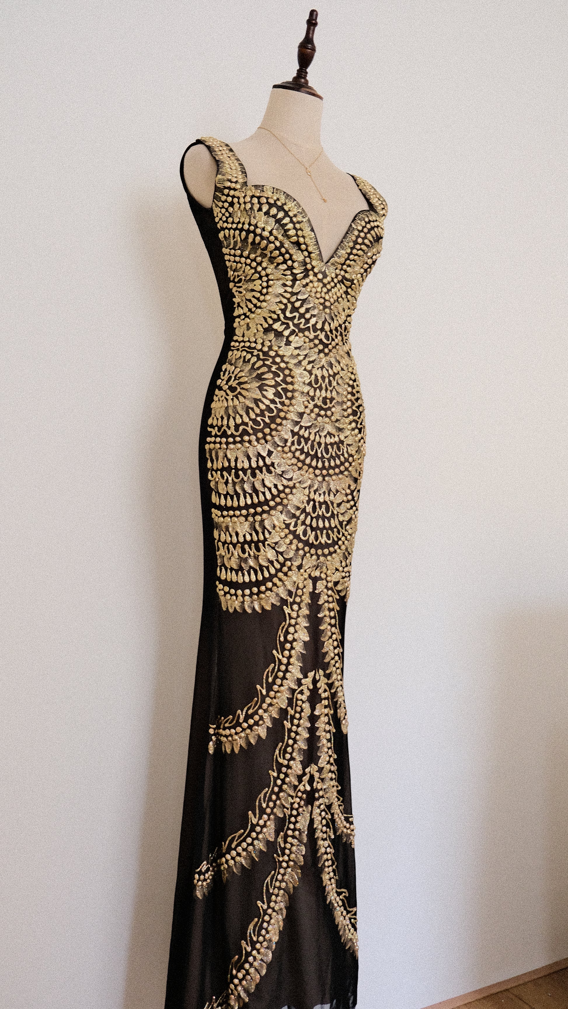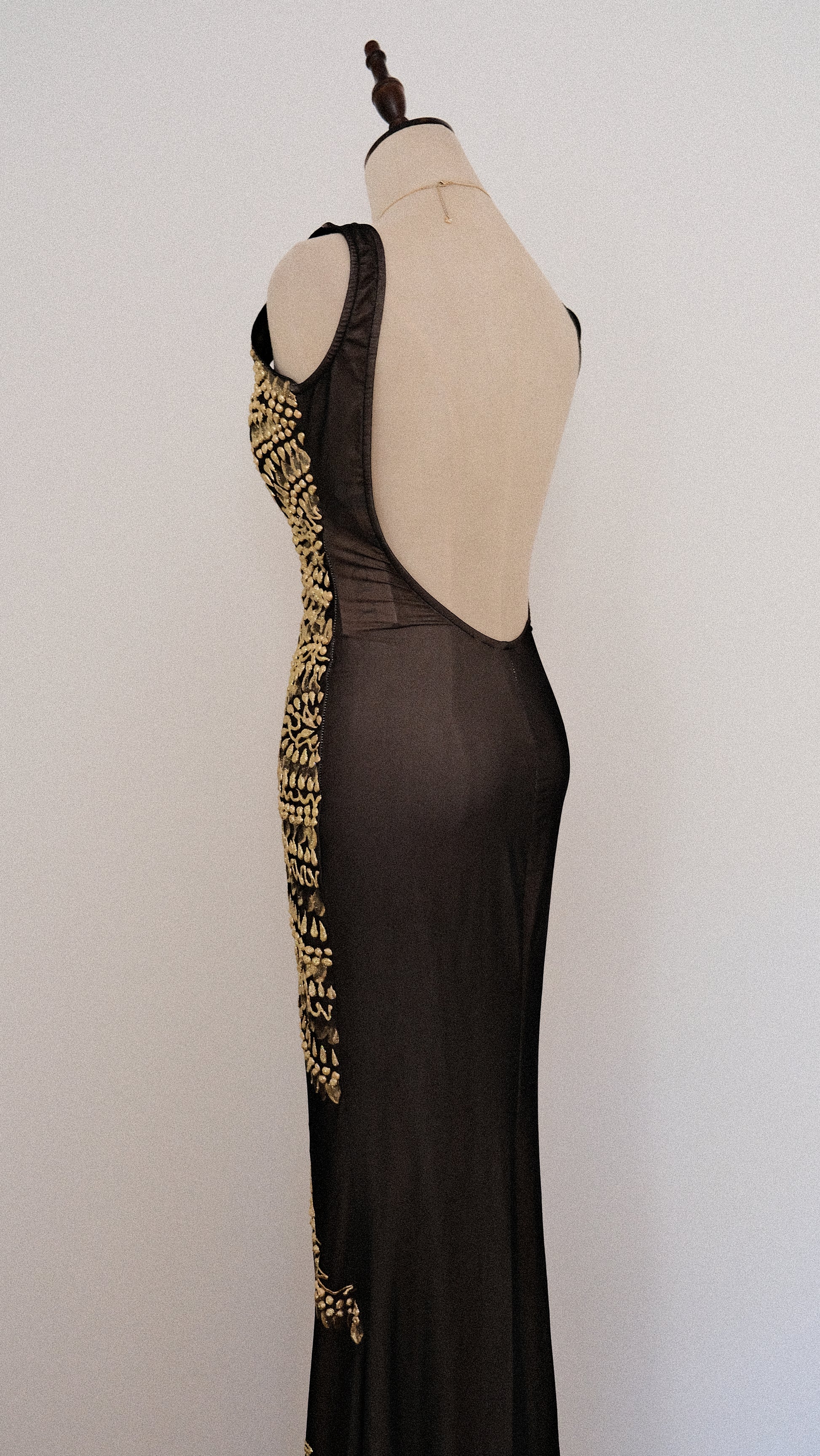 A rare handpainted golden glitter maxi dress with low cut back and mermaid like fitting. Such an eye catcher! The back is plain and has no golden detailing.