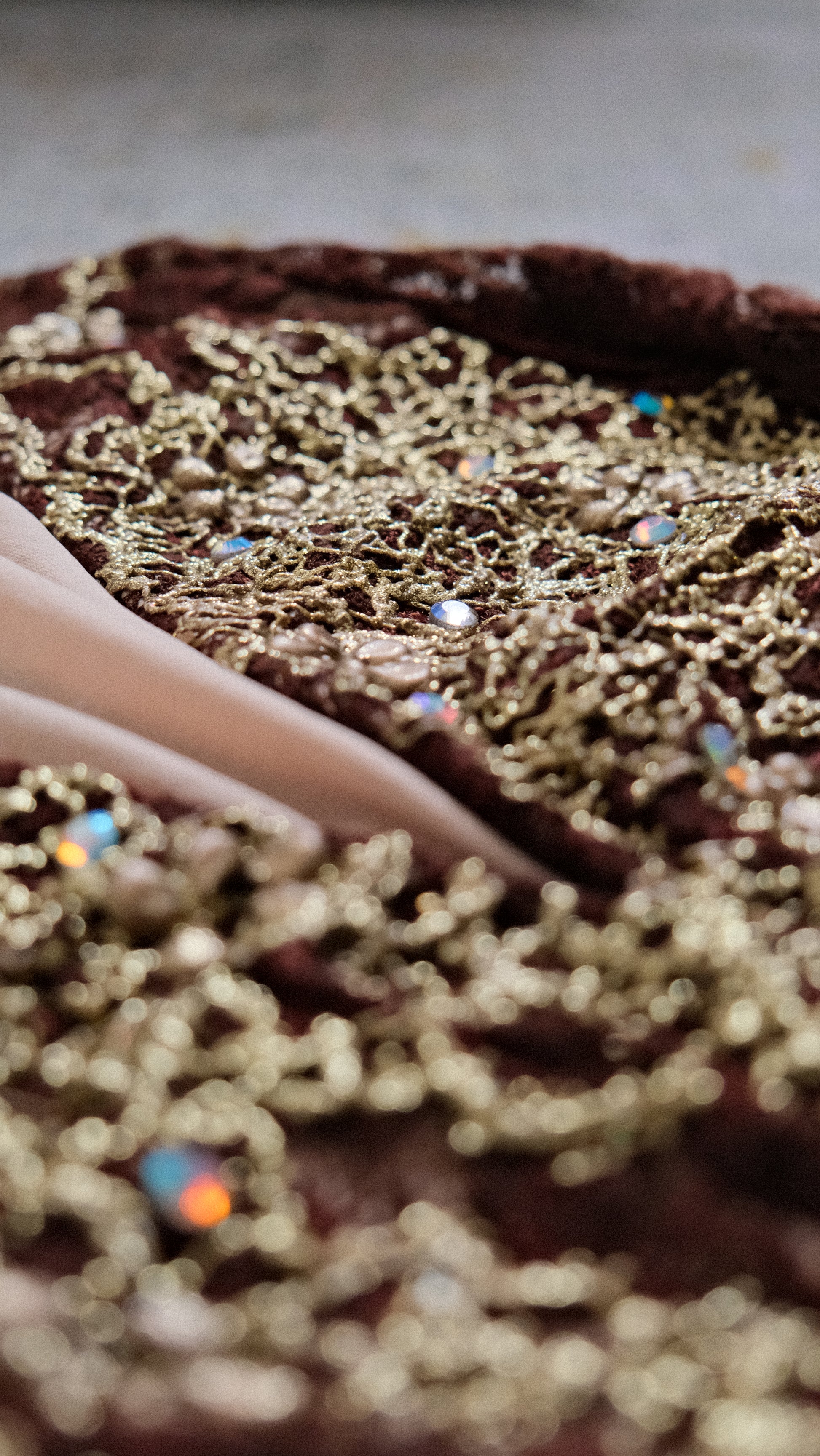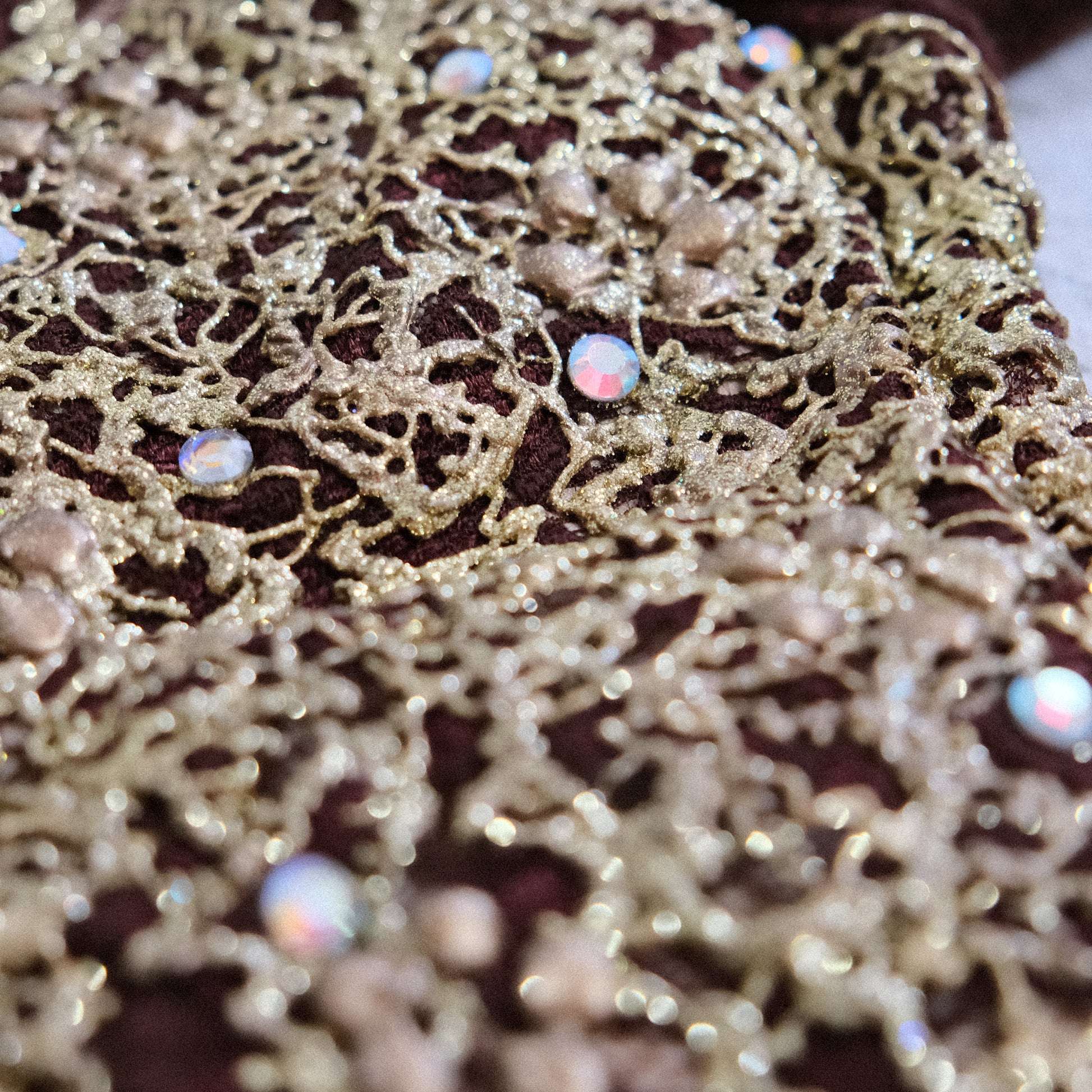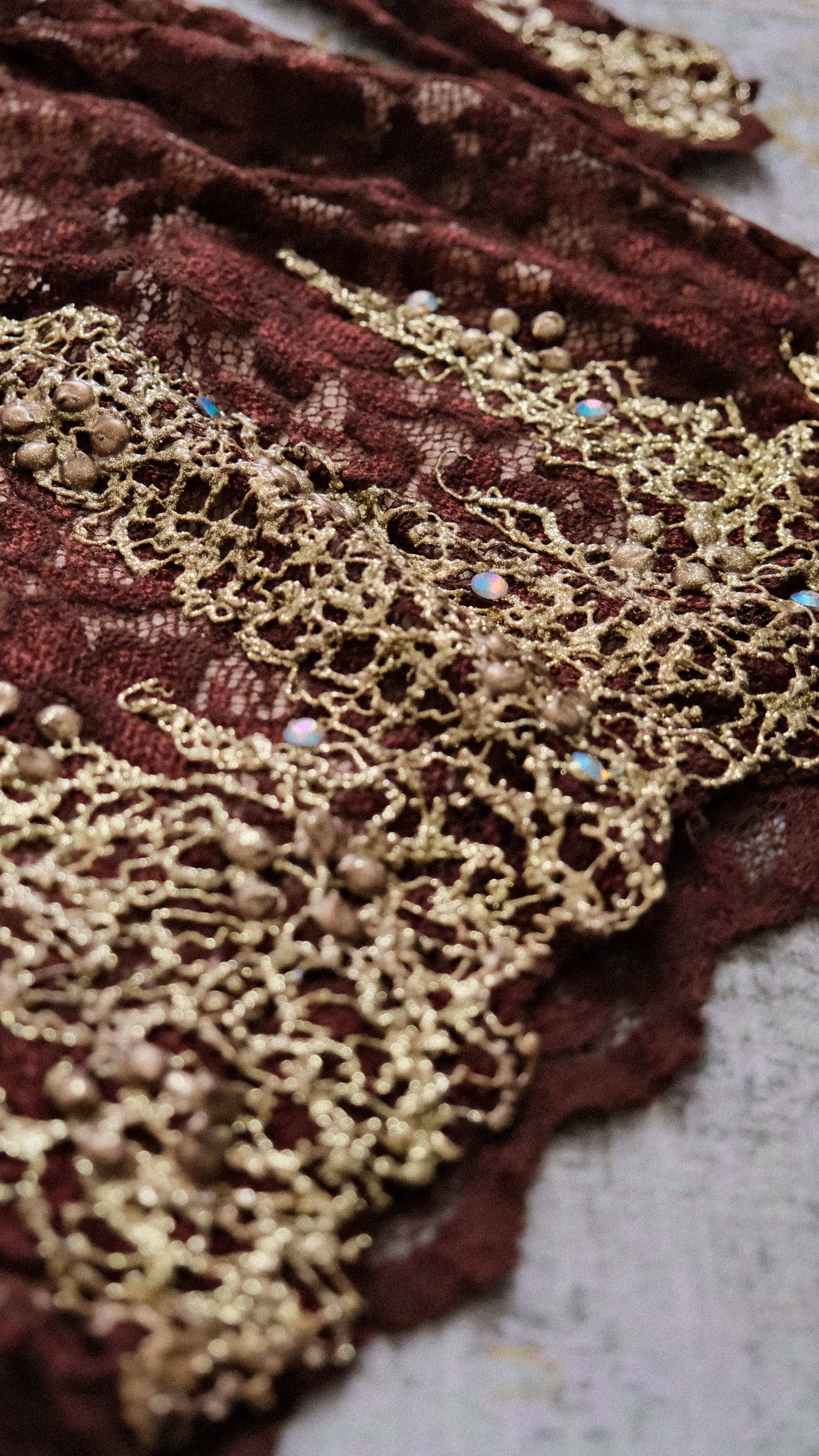 A dress as if woven from the shimmering depths of the ocean itself. A rich brown fabric with painted golden detailing. Back has no golden details.