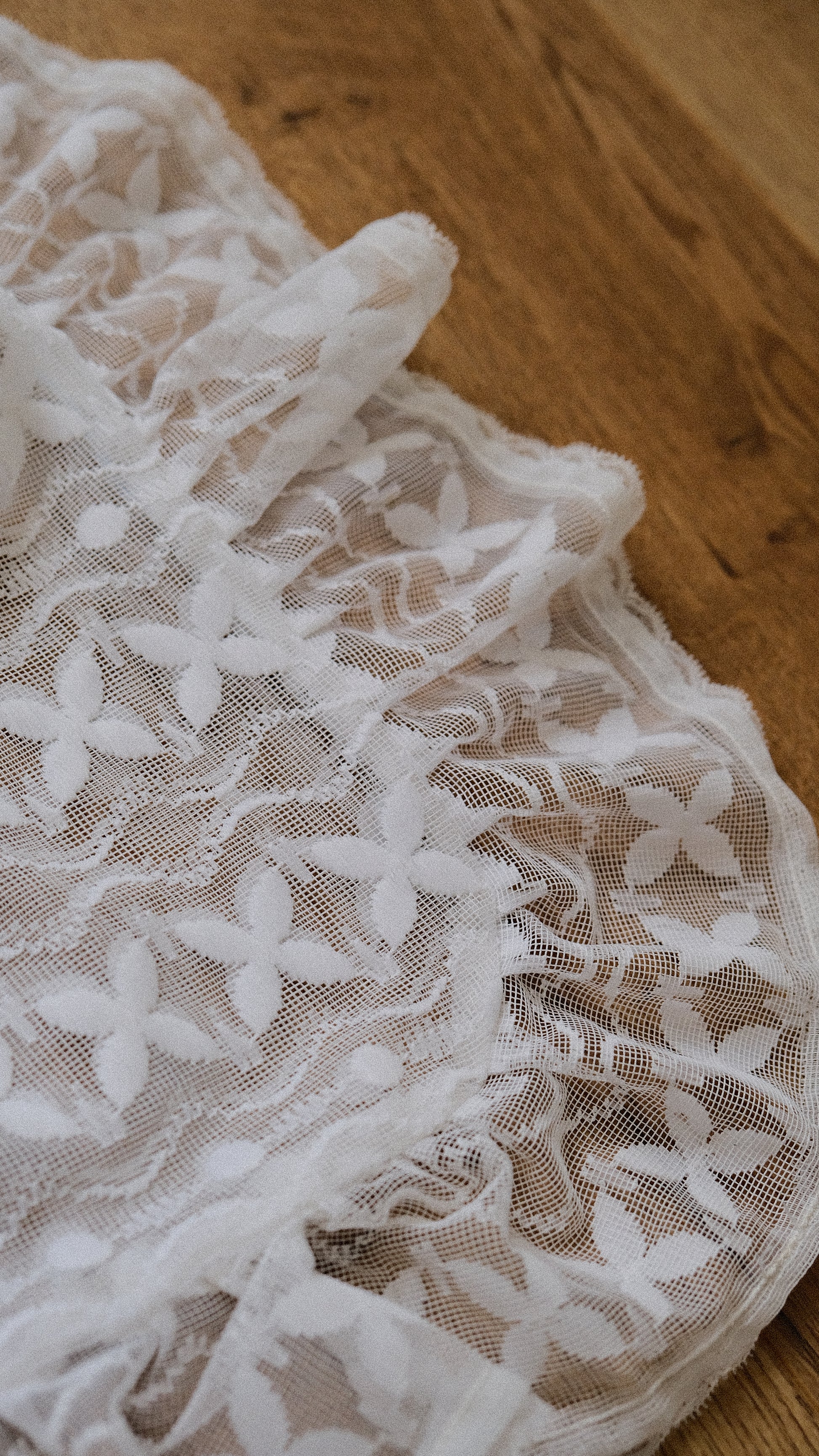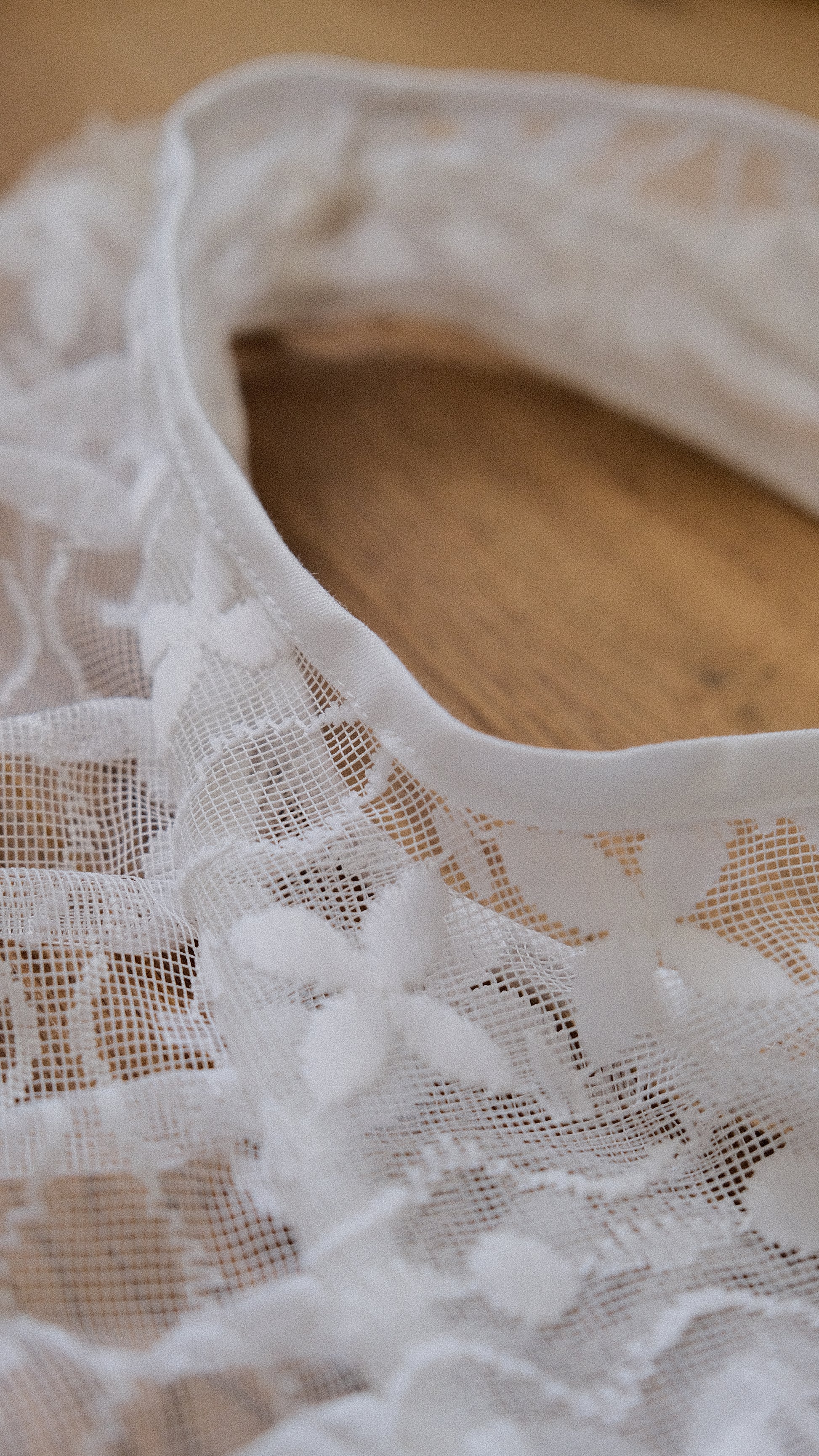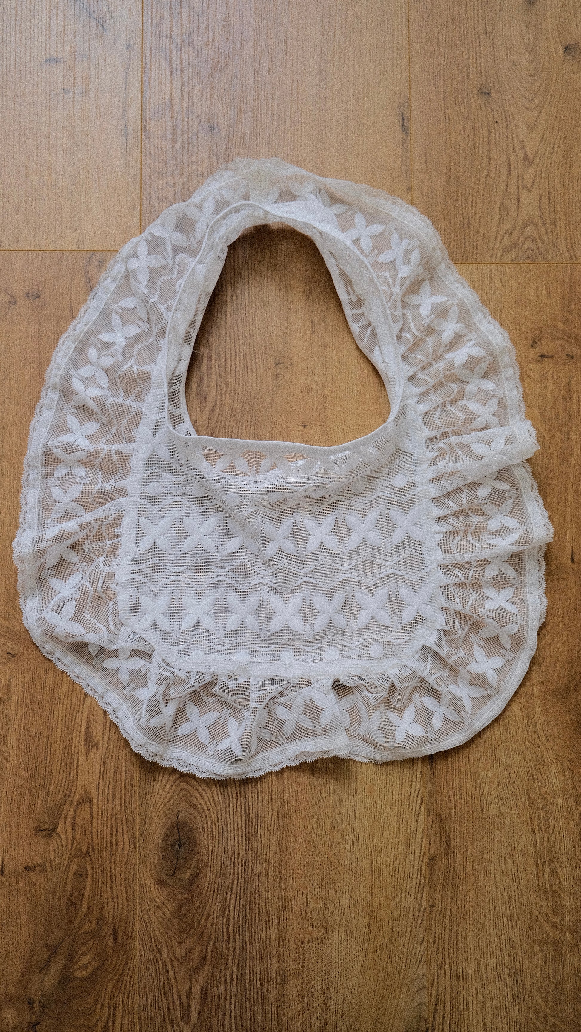 An upcycled lace bag with a flutter edge.