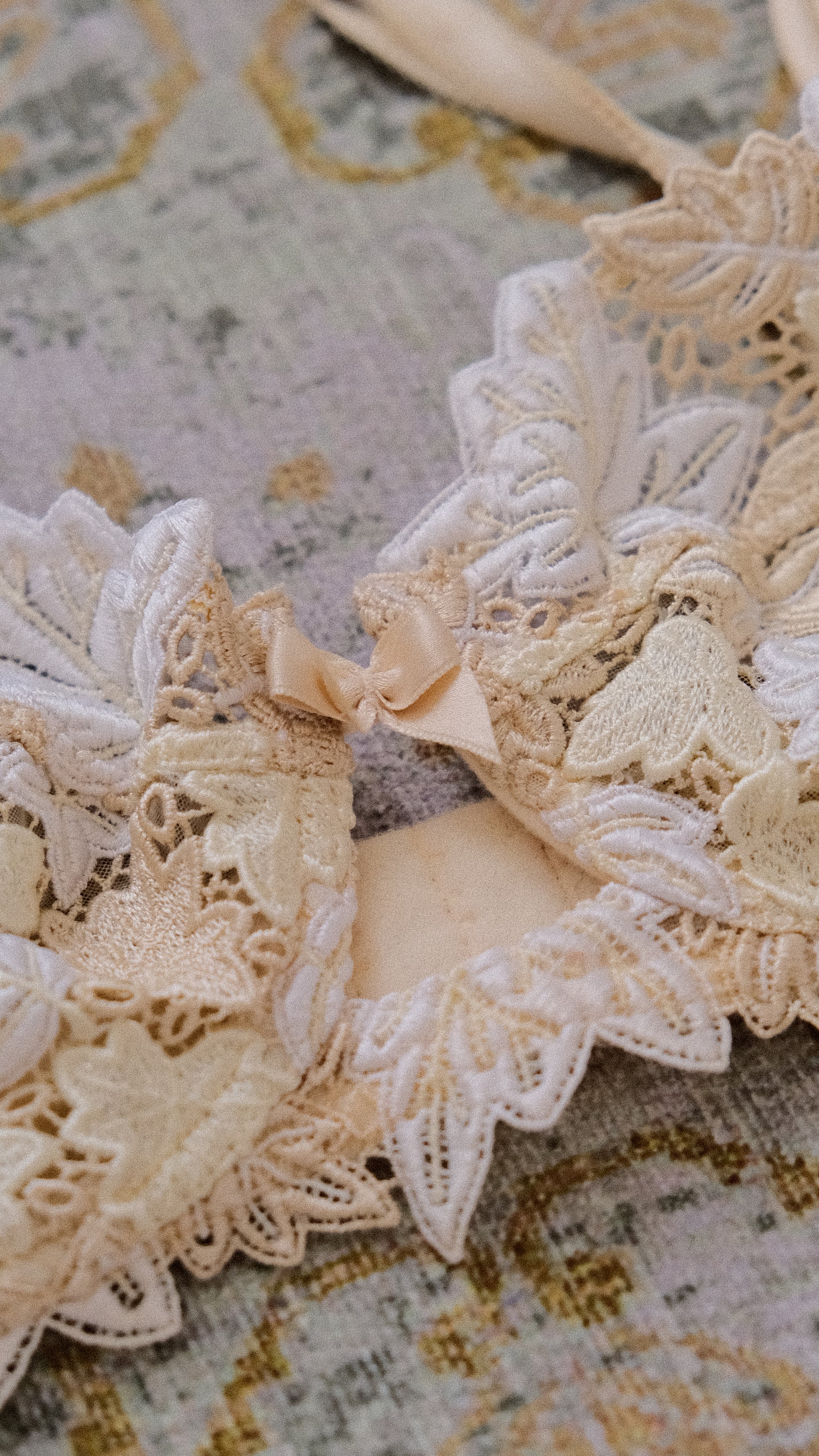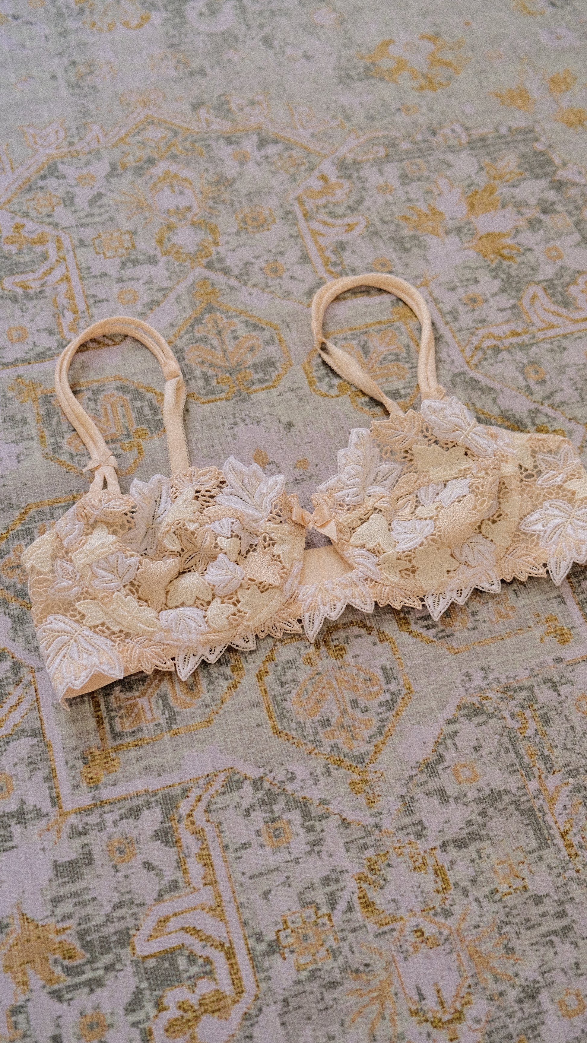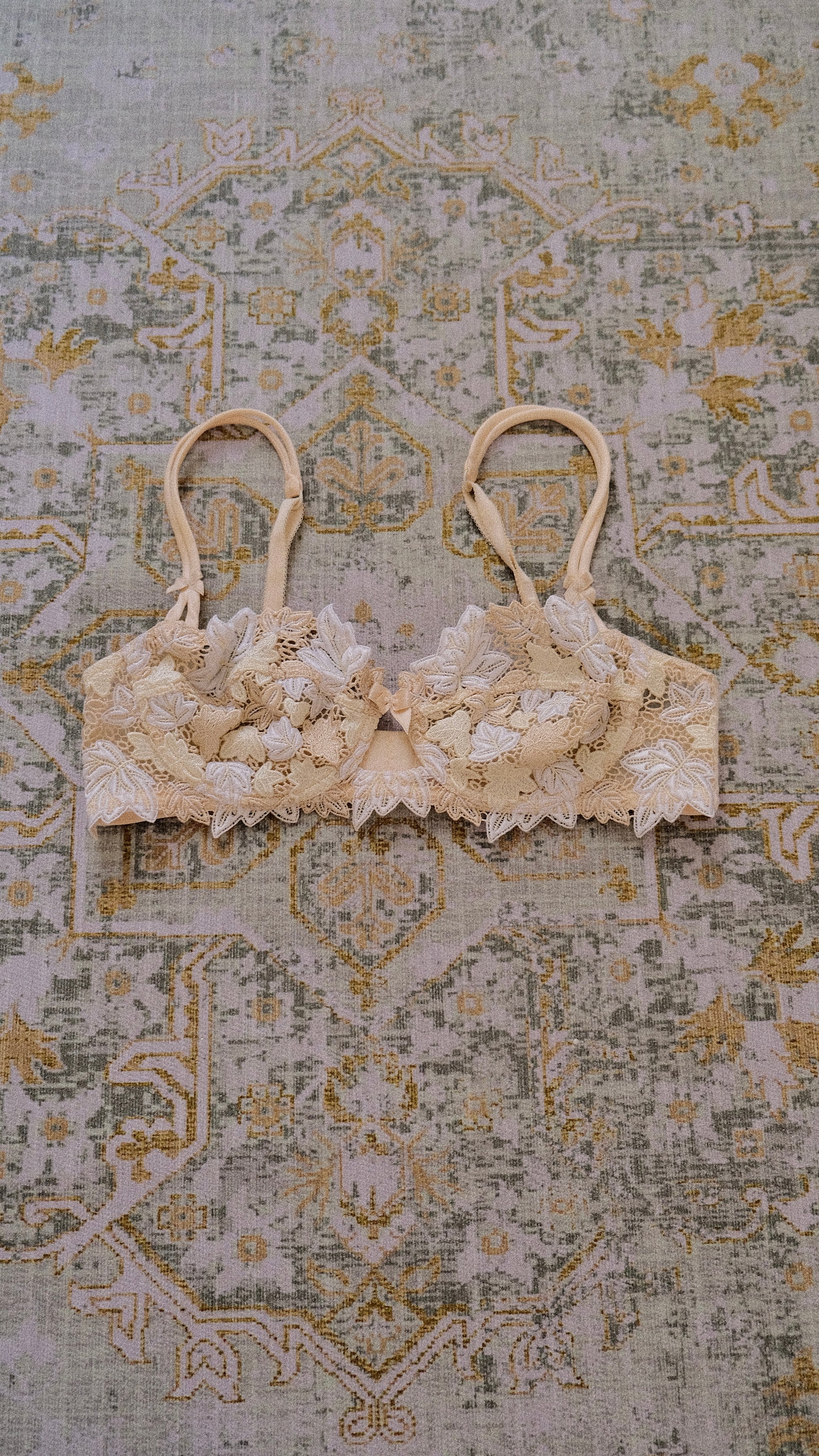 A rare buttercream colored vintage French floral bra.