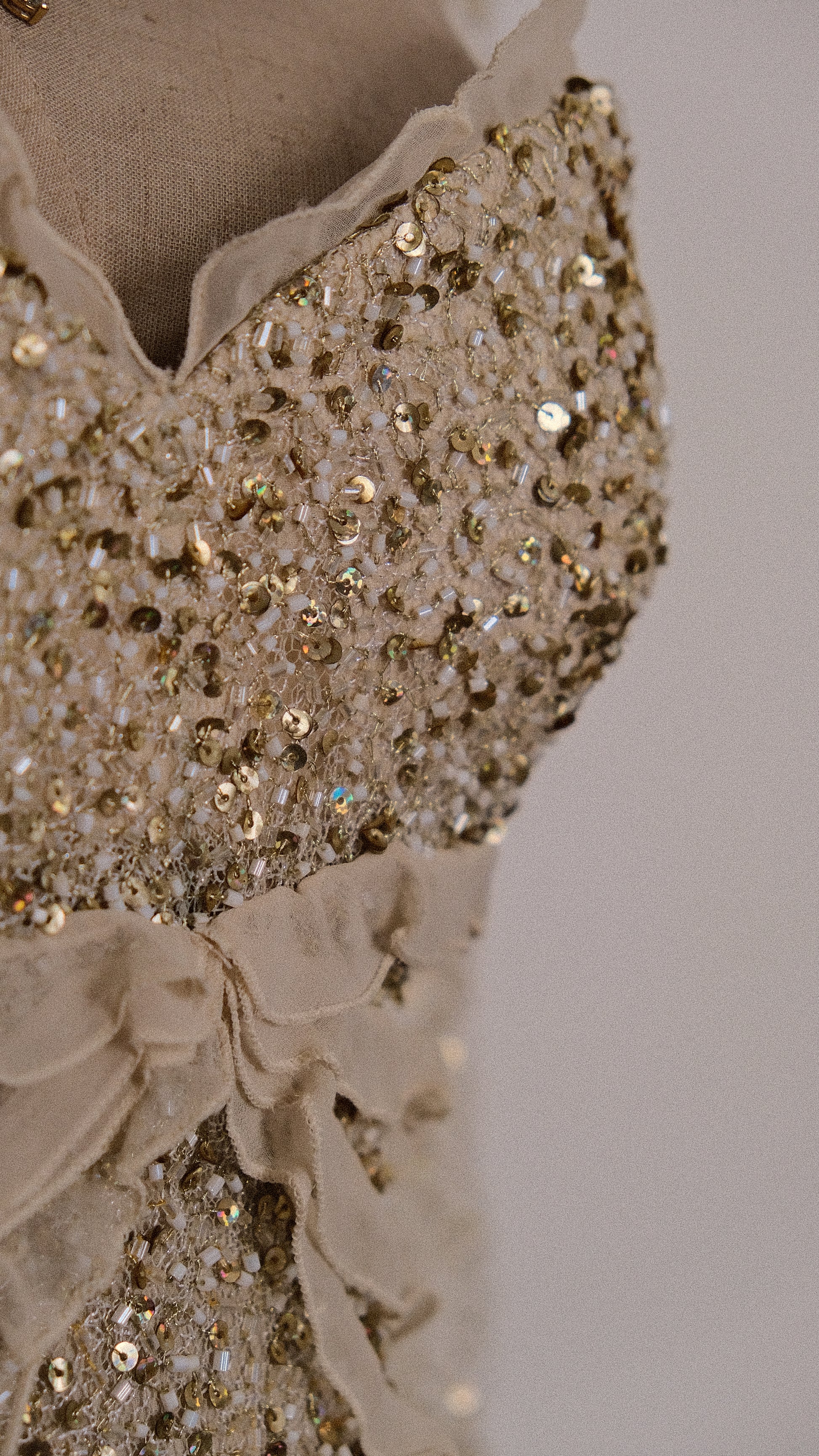 Flaw: Has loose sequins, beads and threats and some damage at the bottom of the dress, see pictures. Price is adjusted.