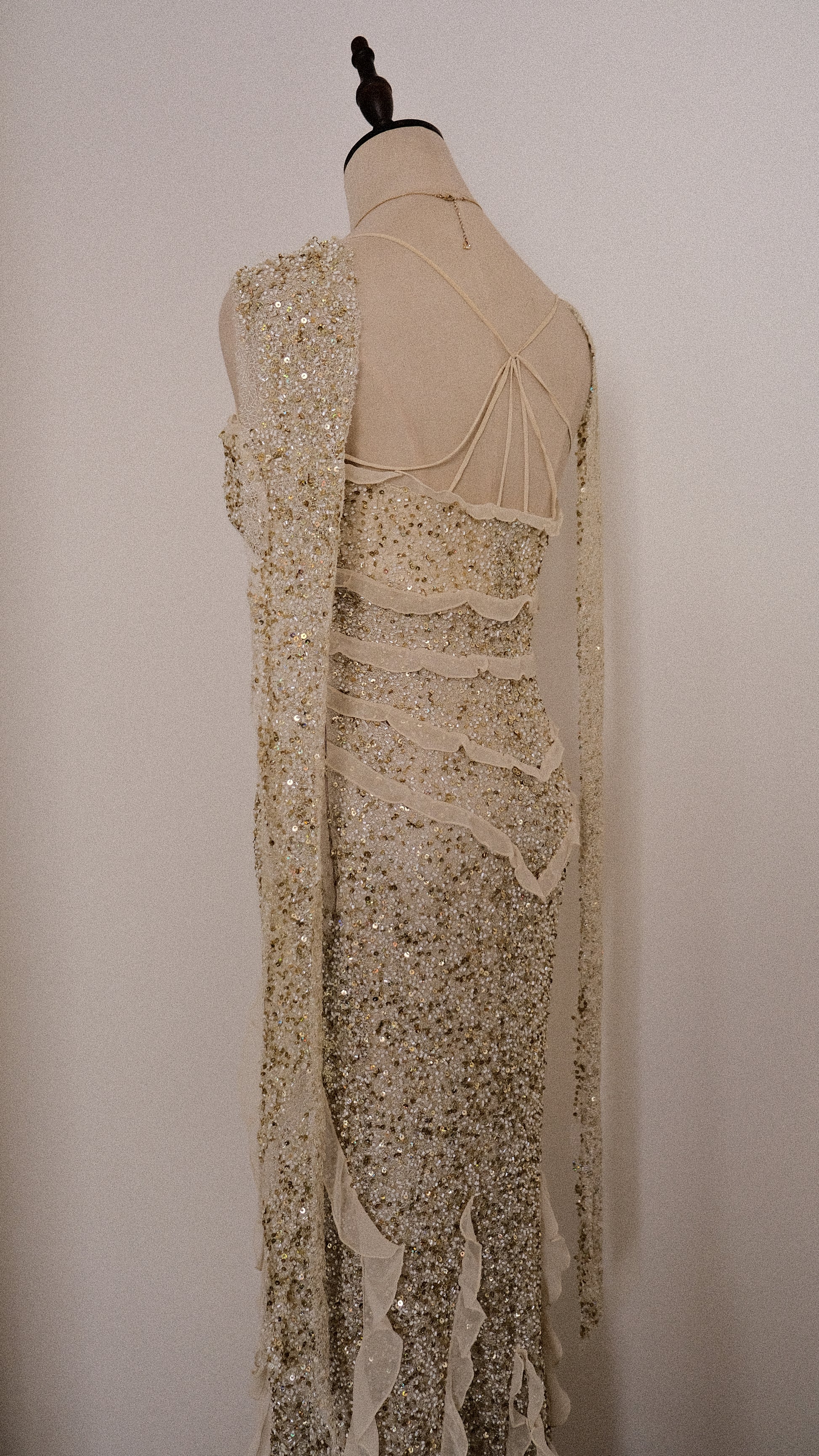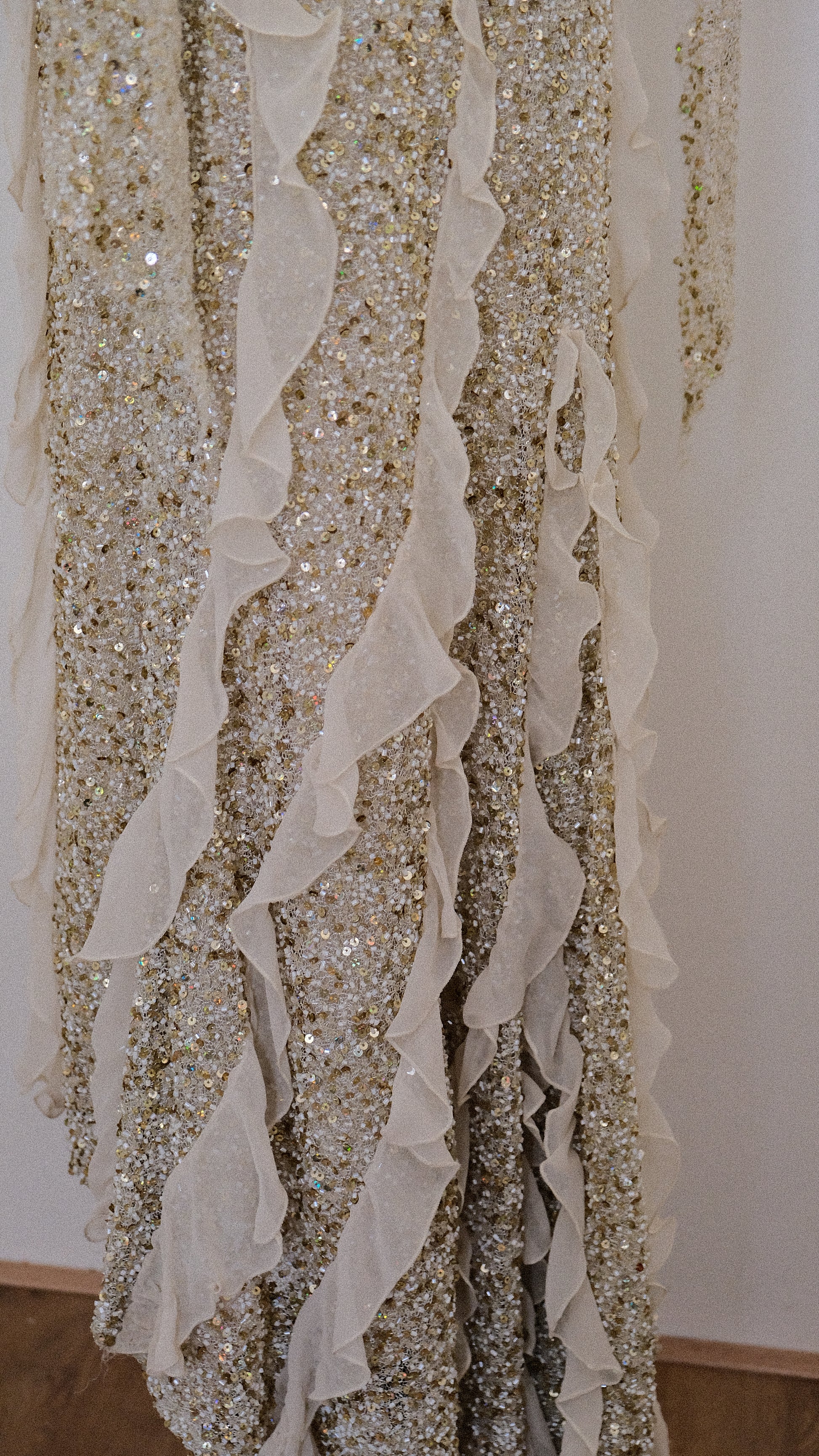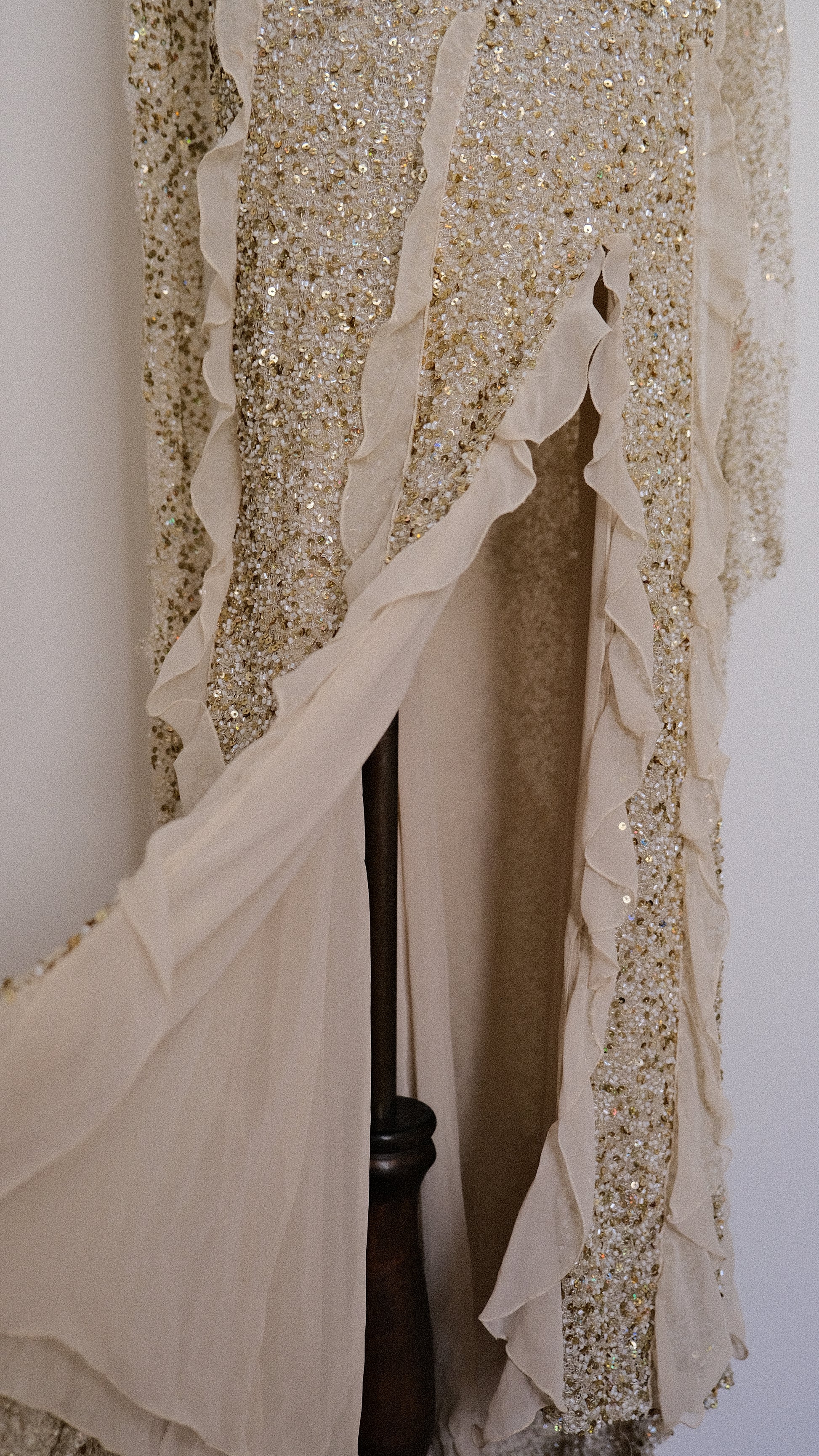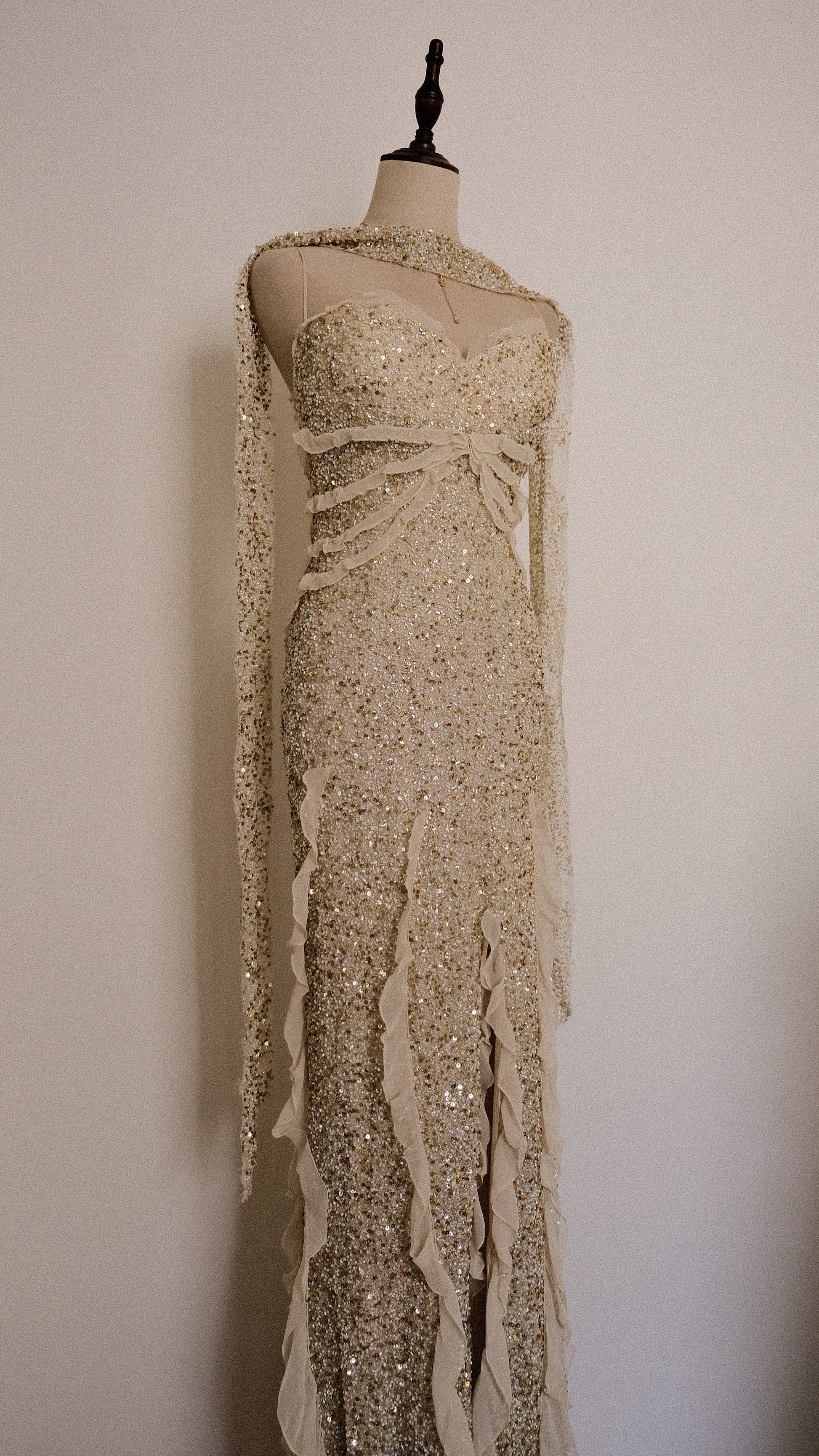 A highly detailed embellished mermaid dress, with the cutest beads and sequins. The dress has ruffles and a split detail at the front.