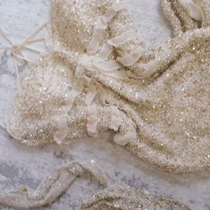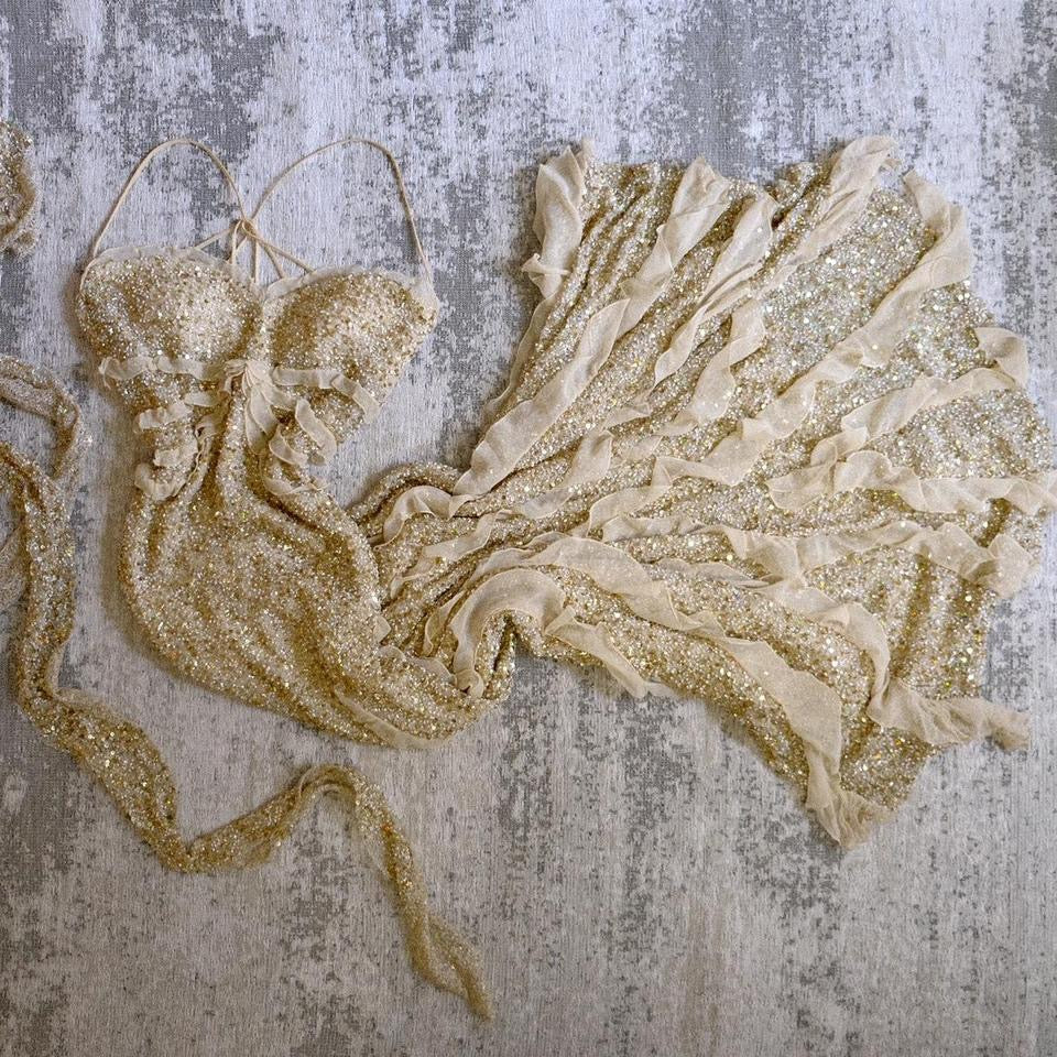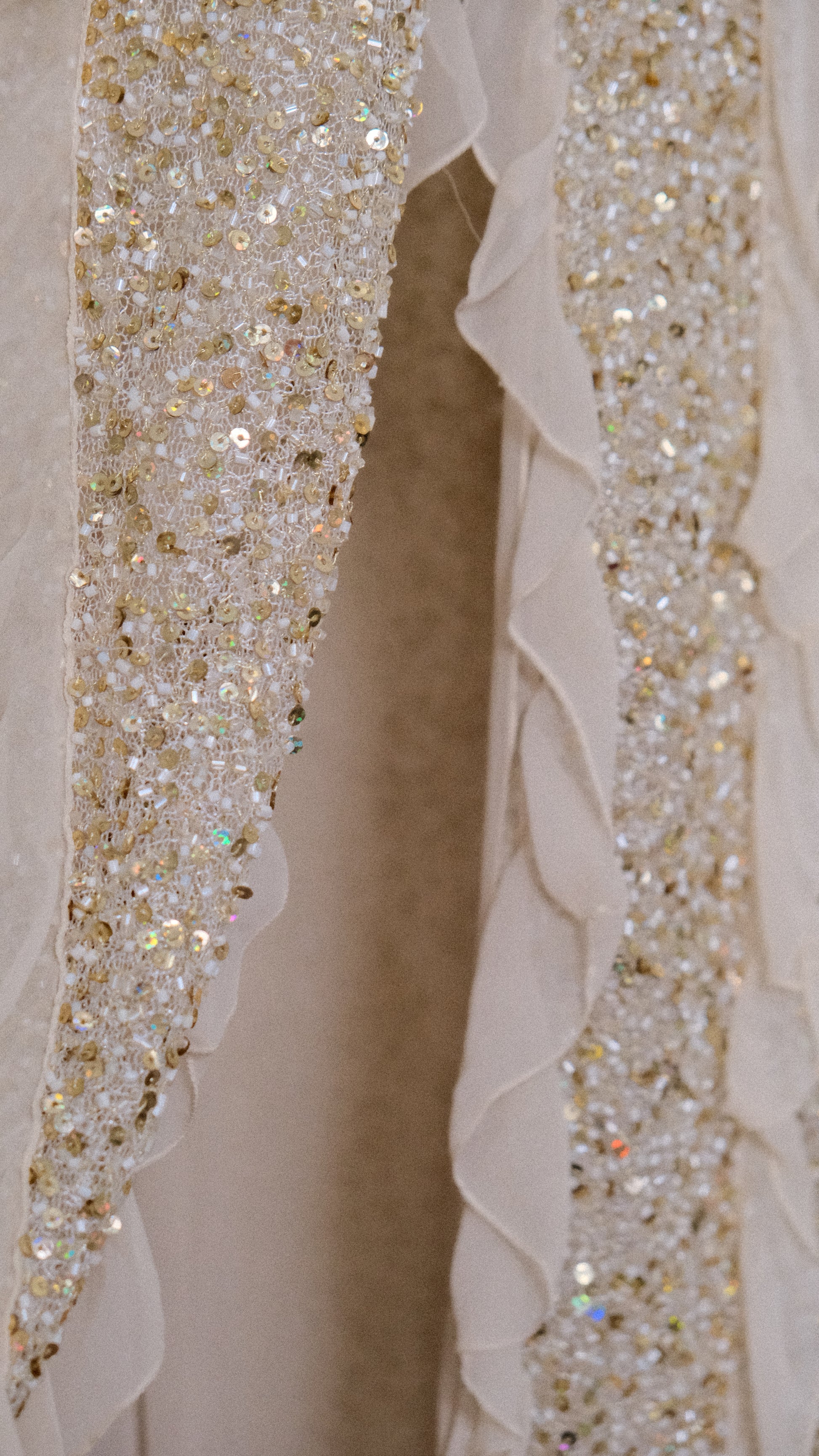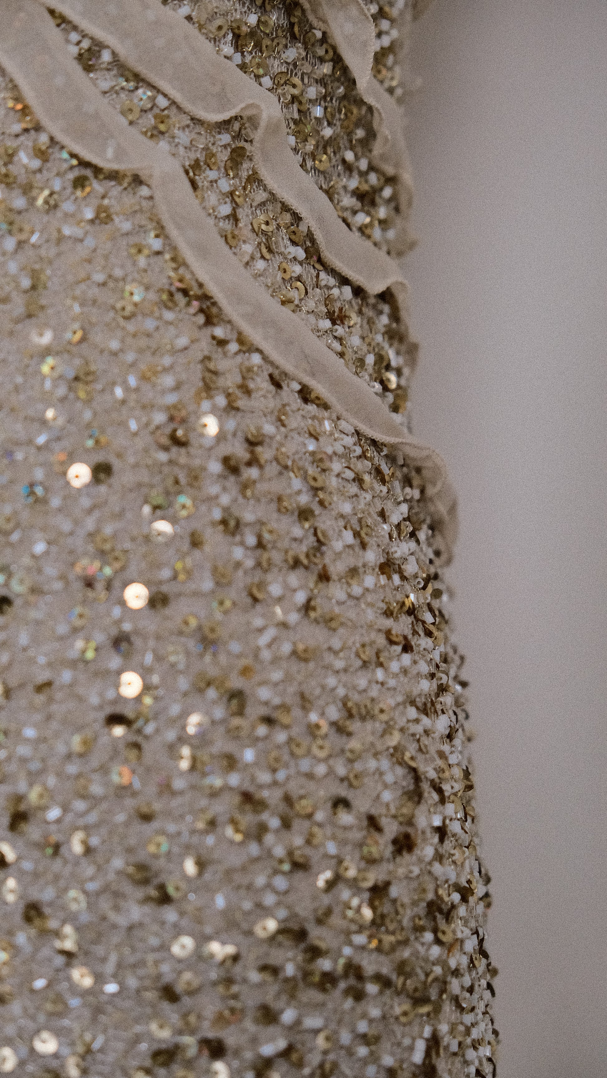 A highly detailed embellished mermaid dress, with the cutest beads and sequins. The dress has ruffles and a split detail at the front.